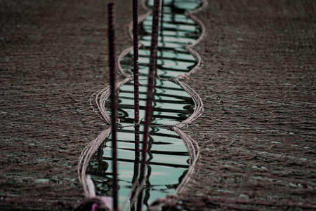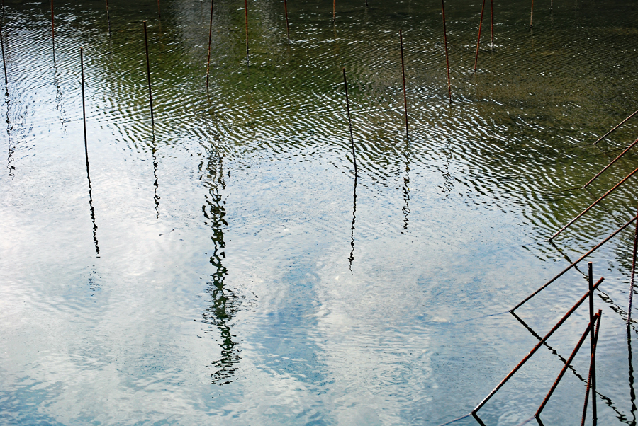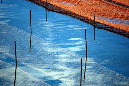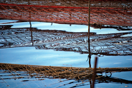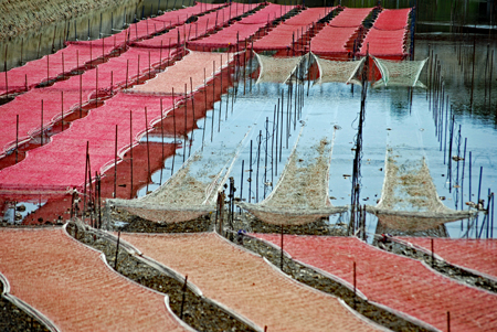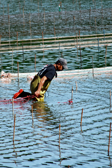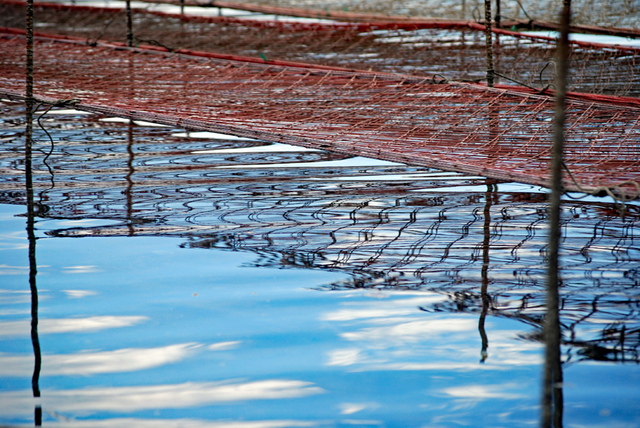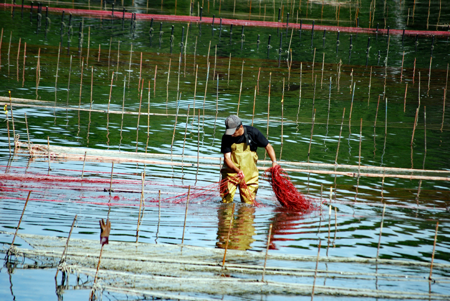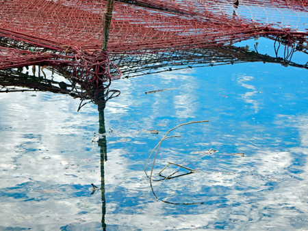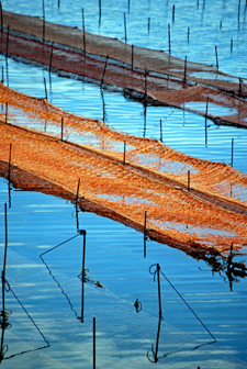 時間がゆっくり動いているという感じの地へサークルの友人の案内で出かけた。初めに浜島の迫子漁港のわきへ車を止めた。中央へ流れる河口にピンクのじゅうたんを敷き詰めたような養殖網が幾何学模様の様相で目に飛び込んできた。山から川へそして河口域を通って海へとつながる命を大切にしてこの地の養殖業は守られているのだと思った。次は五ヶ所浦へと車は進む。ゴム製の胴長を来た人に出会った。海と空は秋色に澄み渡っていた。案内をして下さったN氏に深く感謝しながら初めてであった景色に感動して帰宅した。