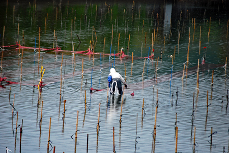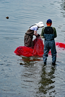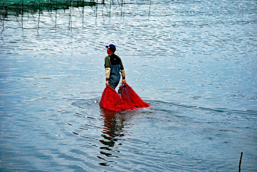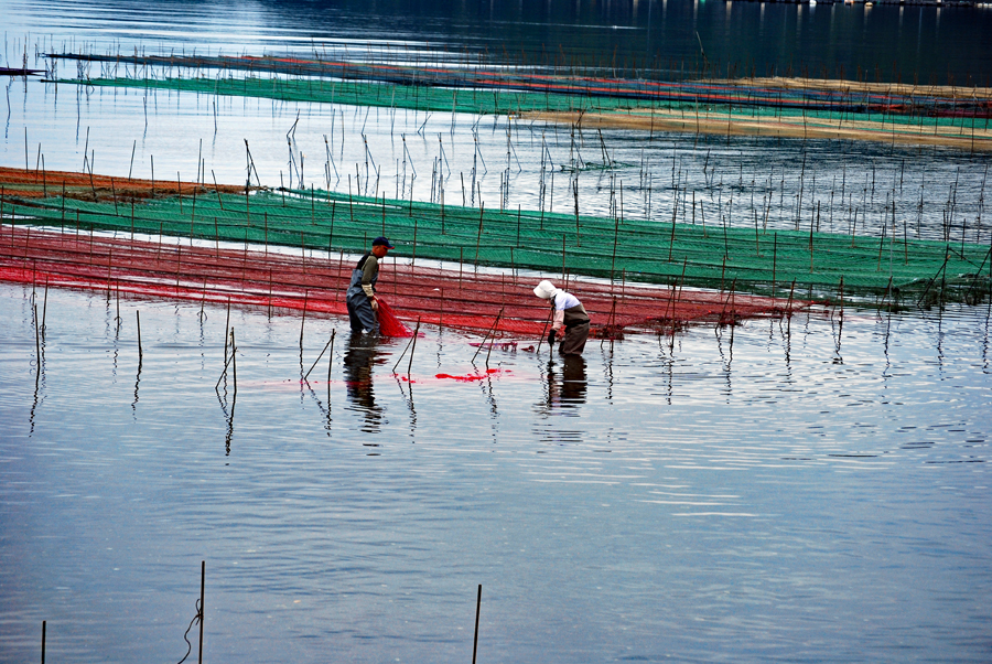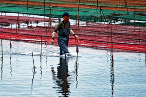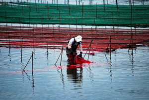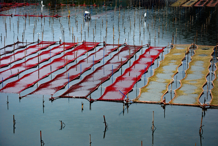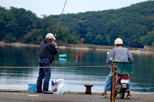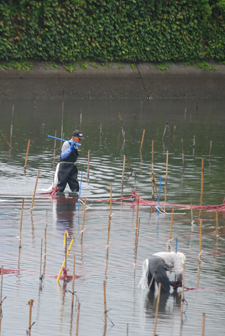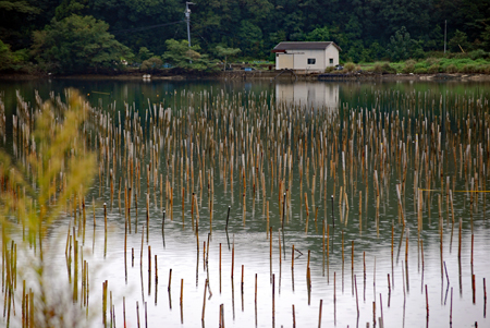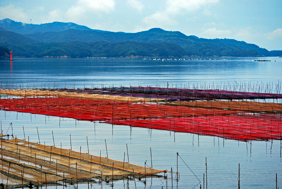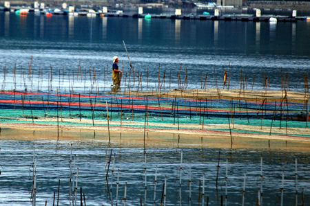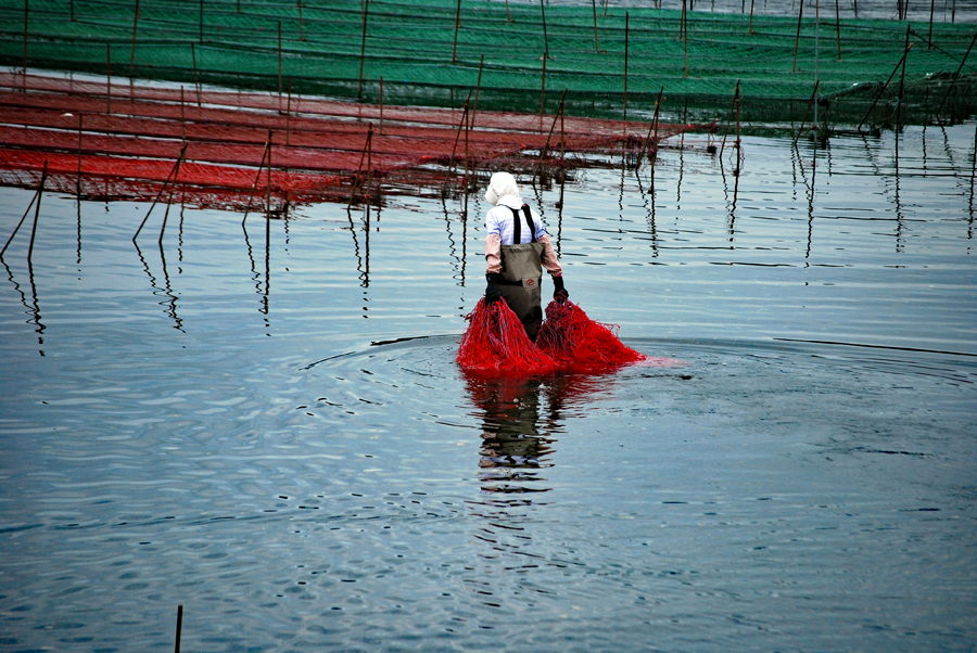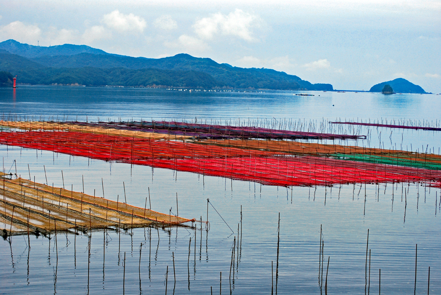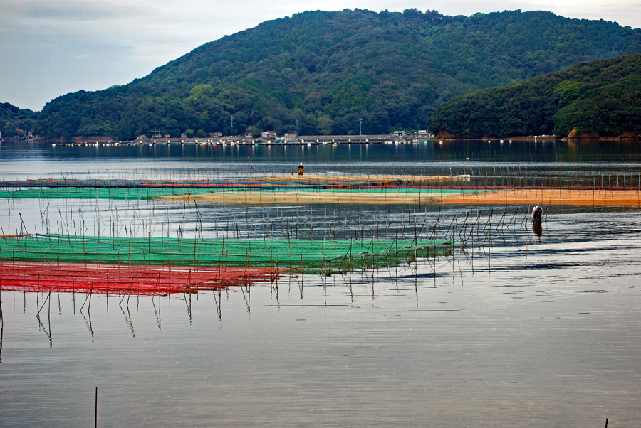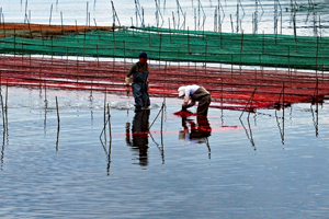 | 伊勢志摩きらり千選に選ばれているアオサノリの種付け作業が始まったとのニュースを見て、潮の満ち引きの加減を見ながらAM9:00家を出た。目指すは五ヶ所湾、、、私が堤防についたとき丁度軽トラがついてご夫婦が網をもって降りていくところだった。「写真を撮らせていただいていいですか?」と私、「いいですよ、どうぞ」と明るく快諾くださった。今回はこのご夫婦にスポットを当ててみた。その姿から生業(なりわい)の厳しさと、一つの仕事に二人で打ち込む清々しくも神々しい姿に接し深い感動を覚えた。これから私はアオサ汁を食するごとにこの日のお二人の姿を思いだすでしょう。 |