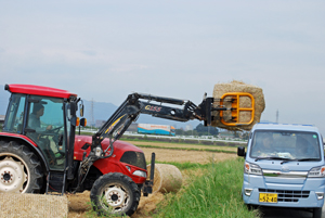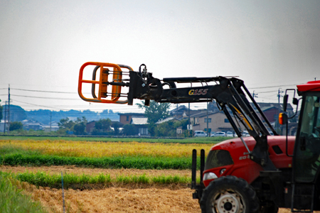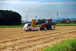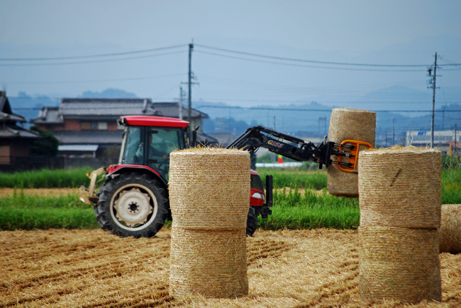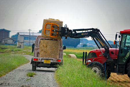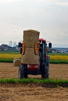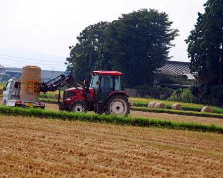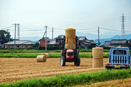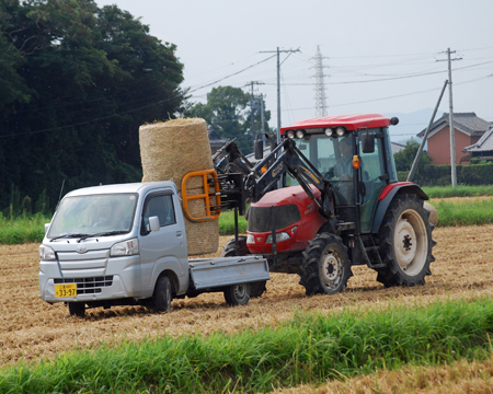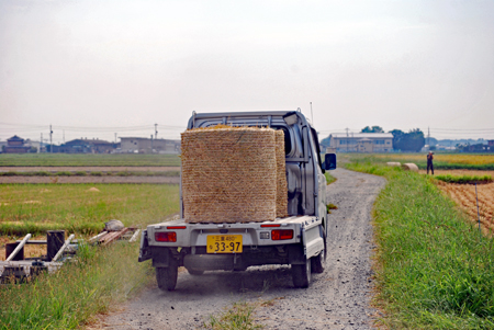 春の田植えも秋の刈り取りも手作業でしていた頃の農村風景より知らない私、、、気がついたらすべてが機械化され昔の面影はない。早場米の刈り取り後の藁の始末をしている田んぼの景色が見られるというので早朝車を走らせた。軽トラック4台ぐらいで次々運んでいくのであっという間に姿を消してしまった。