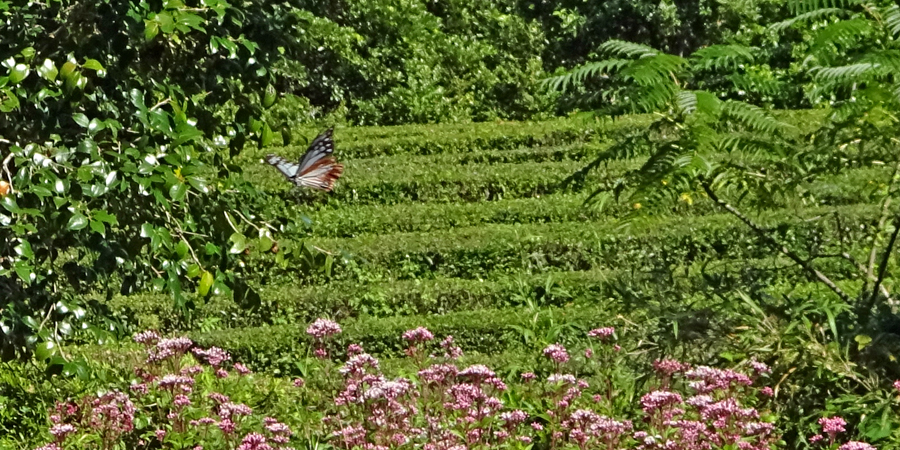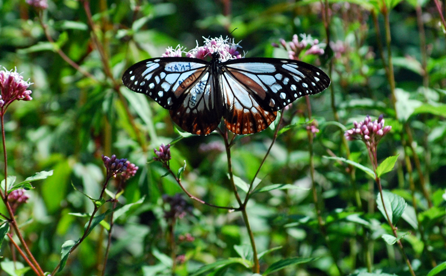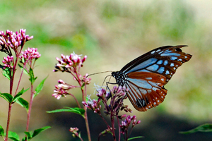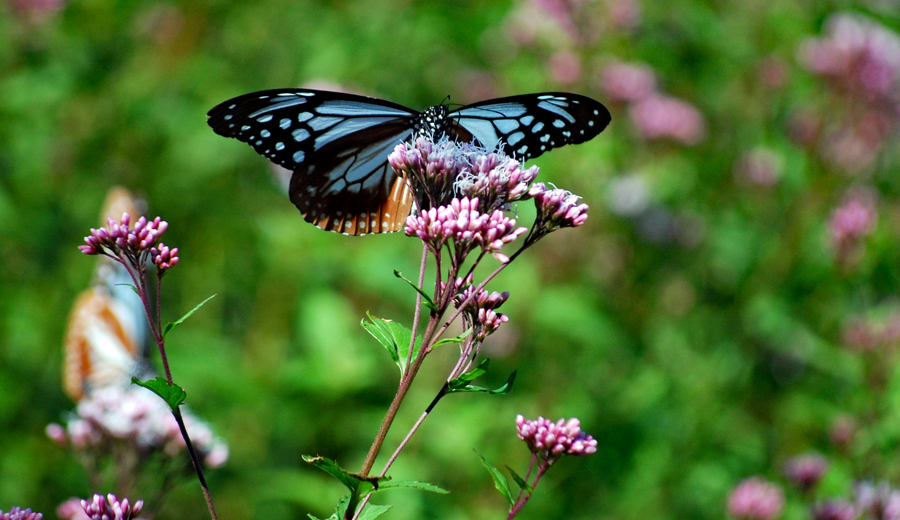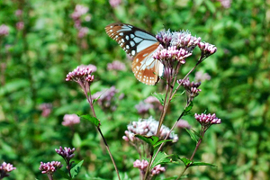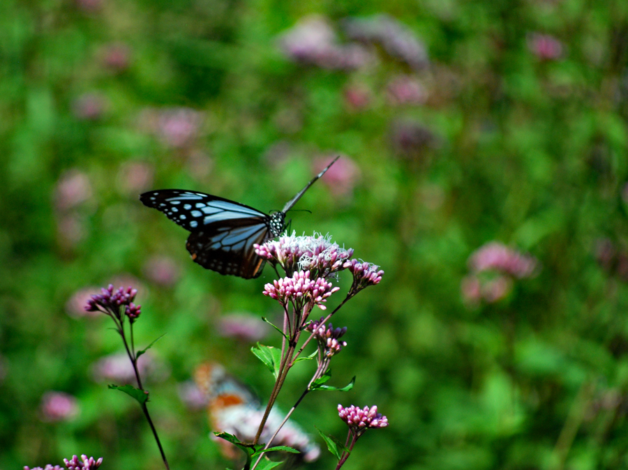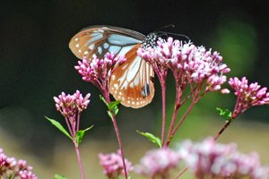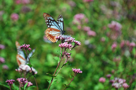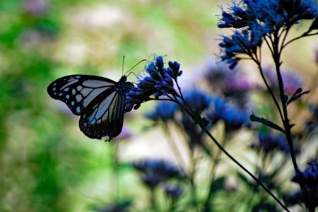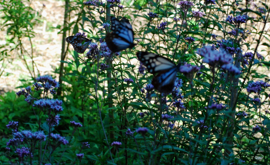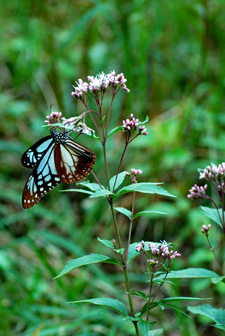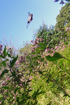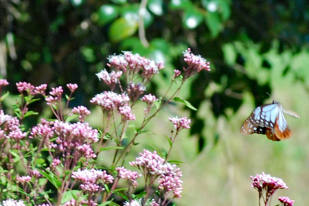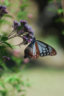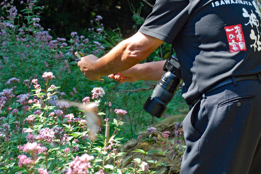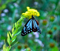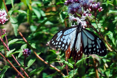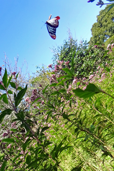 | やっと爽秋の季節がやって来たという実感の沸く今日、空いっぱいの青空に魅せられてアサギマダラを求めて安楽島へ、、、参道は竹林を抜けると光の量が微妙に変わり明るくつややかで秋の光が花々を咲かせ静かです。のあざみが咲き背高泡立ち草の群生を過ぎるとフジバカマの植えられている小高い丘につきます。先客が一人見えて間もなくもう一人(昔の知人)が現れた。FBで知る浜口氏であることを初めて知った。今回先客(上村氏)とも初めてで有意義な時間を過ごさせていただき写真もたくさん撮ることが出来た。ご両氏に深く感謝です。 |