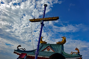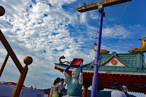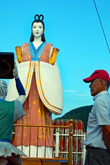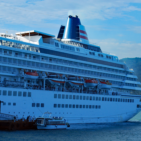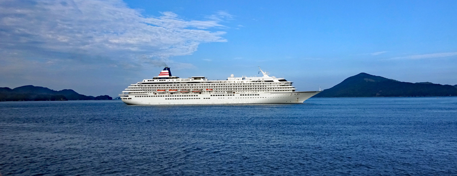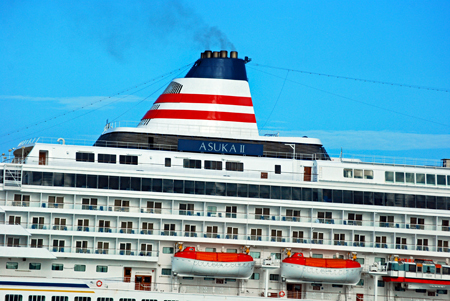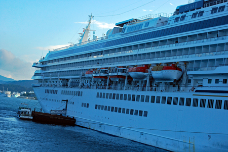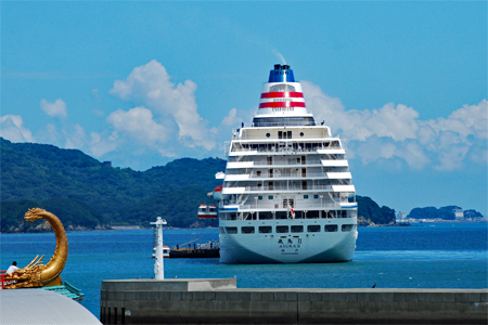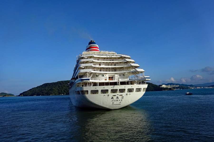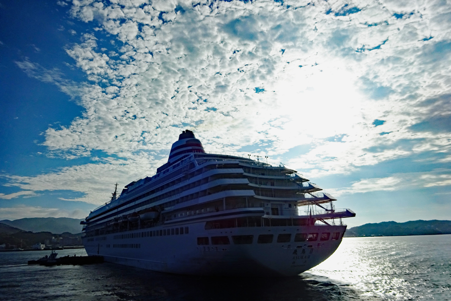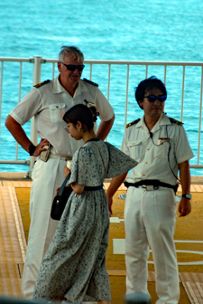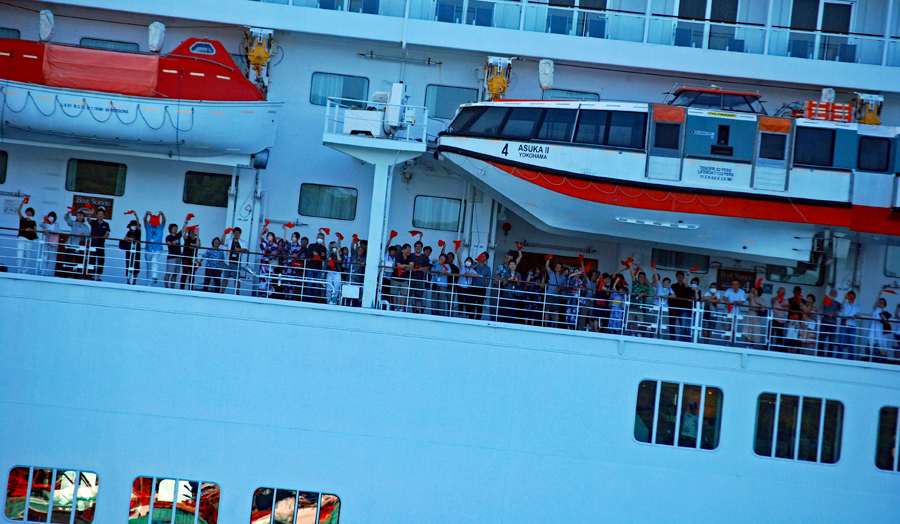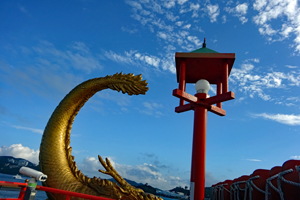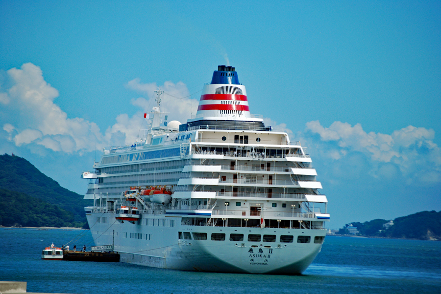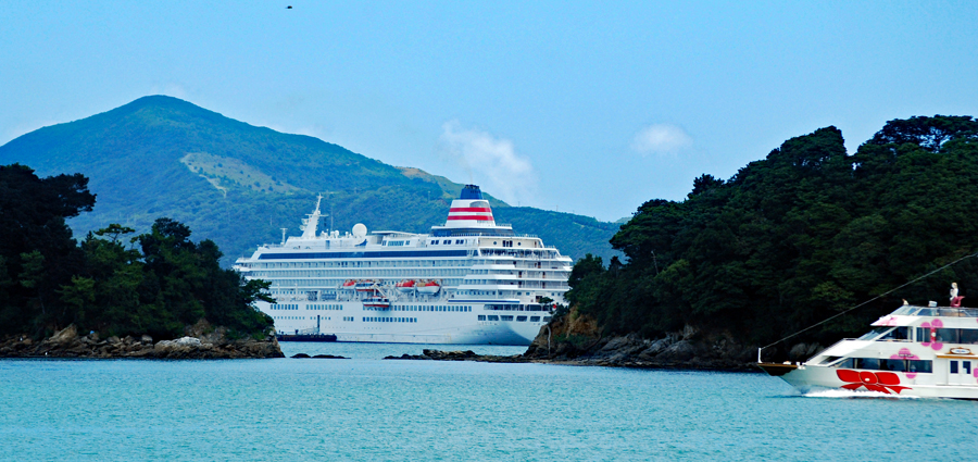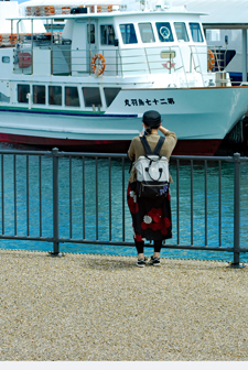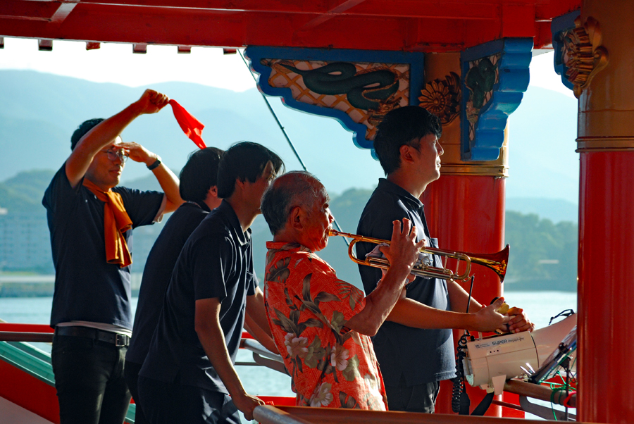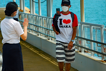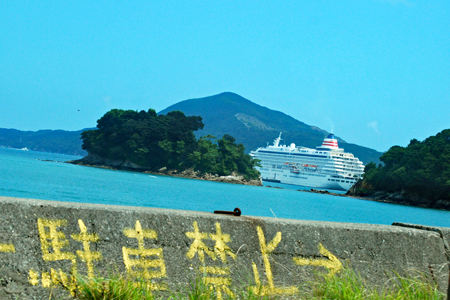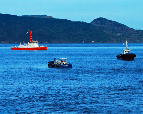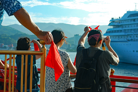 今回は赤いハンカチでのお見送りの時間に行くことにした。PM:5:00出発でお客様は皆乗船を済ませていた。4:30チャーター船でお見送りが出来た。台風一過爽やかとまではいかなくとも波は静か、風はなく夏雲が青い空を覆い夕方出かけたことのない私には珍しく興奮もし又心遊ばせる豊かで貴重な時間だった。