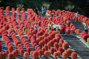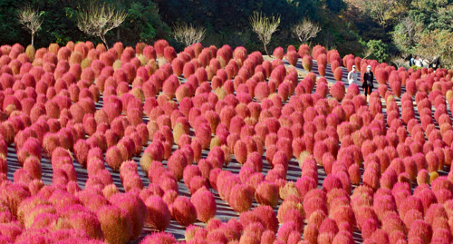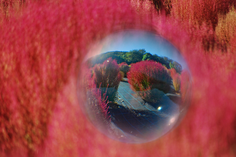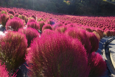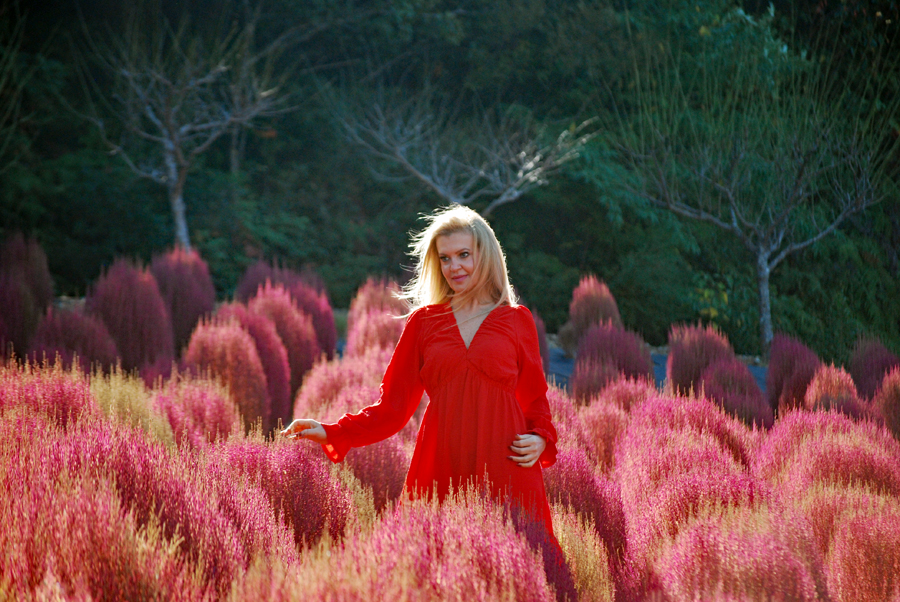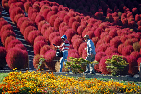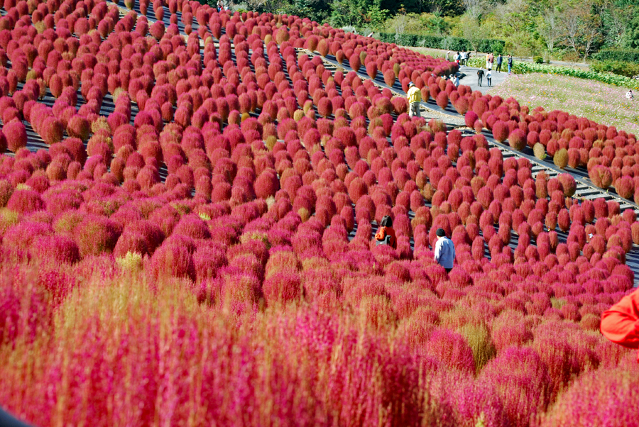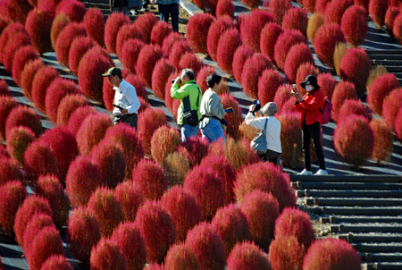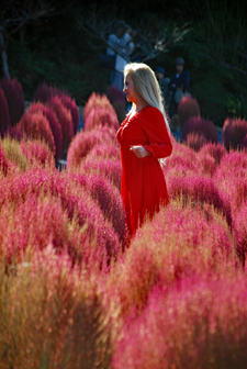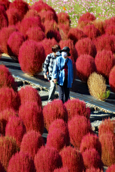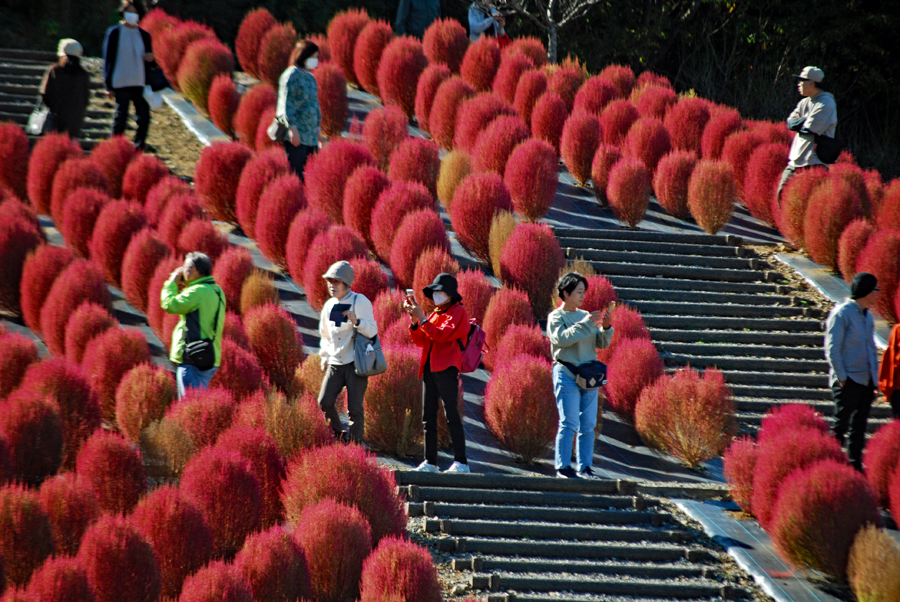 | 立冬とはいえ全く冬を感じられない今日この頃、TVのニュースでコキアの紅葉の様を見て朝から出かけた。新聞やTVで報道されたせいか見物客はいつもより多い。今の季節を象徴するようにひまわりが元気よく咲いているのが目を引いた。人生悲しいの、残酷だのと言いつつ結構移ろいゆく四季の花々や木々の成長に救われているのではないか?今は錦繡の時という光輝く日々を老いの身ながらもう少し楽しみたいと思う。 ★赤いドレスに着替えている外国の彼女にお願いをして写真を撮らせていただきました。快諾してくださりとても感激しました。 |