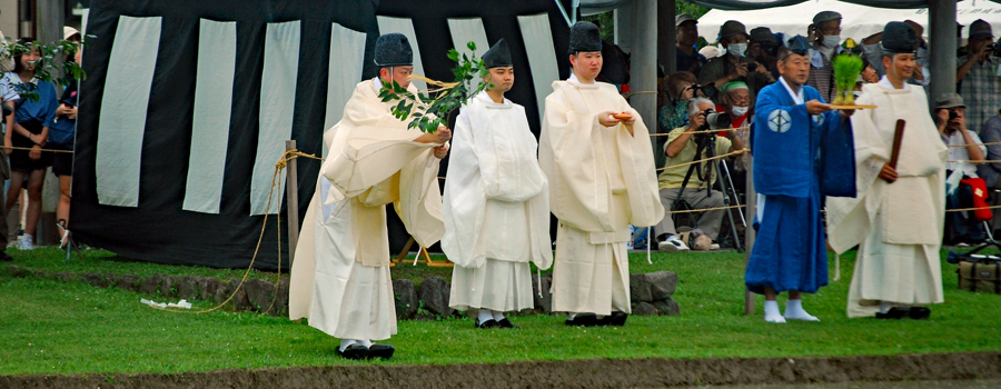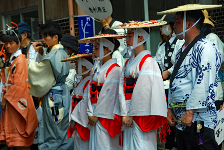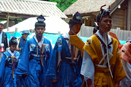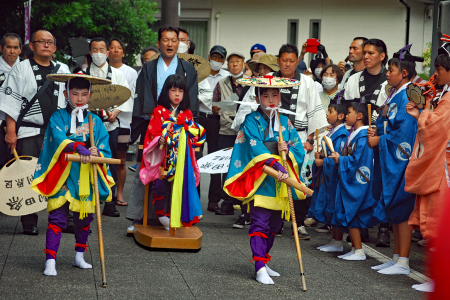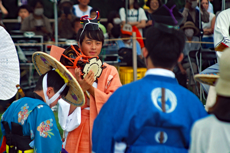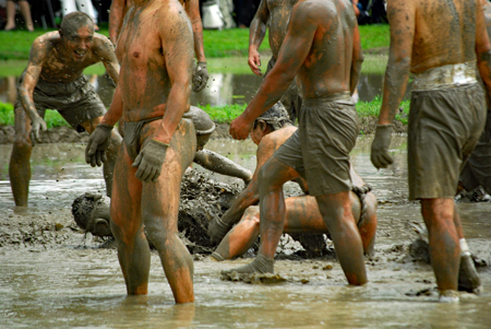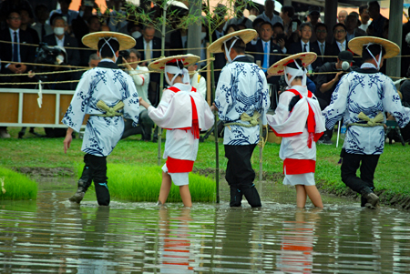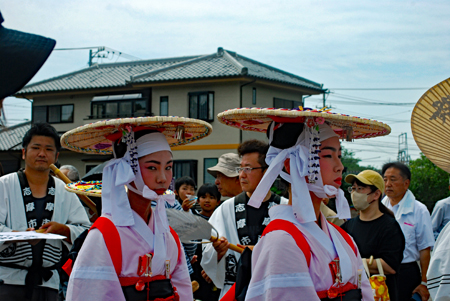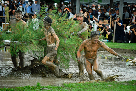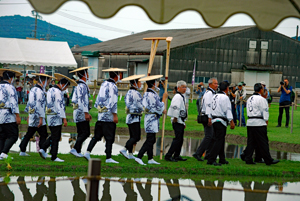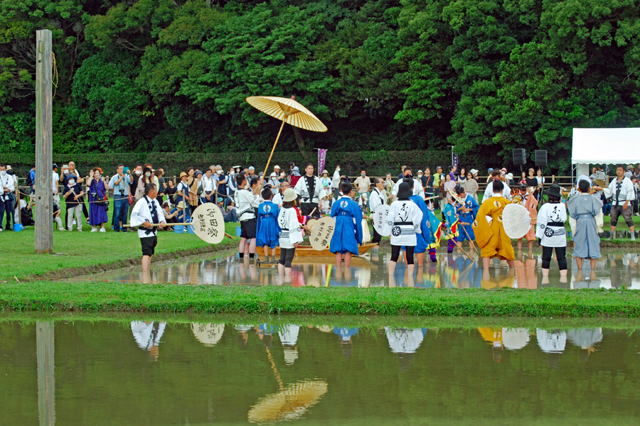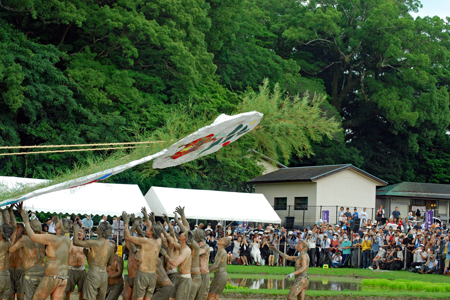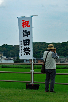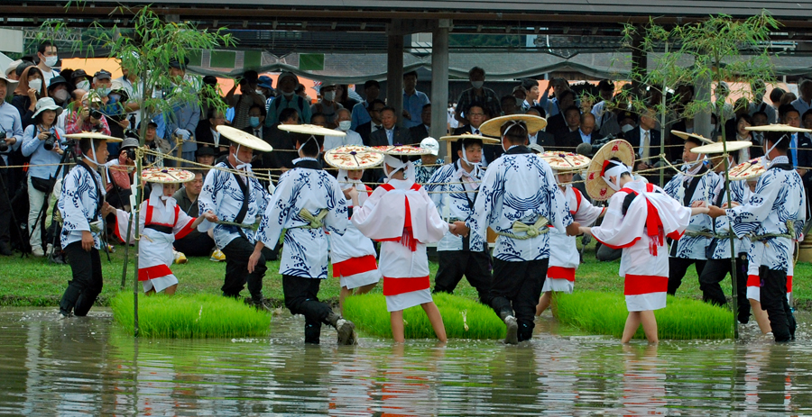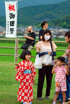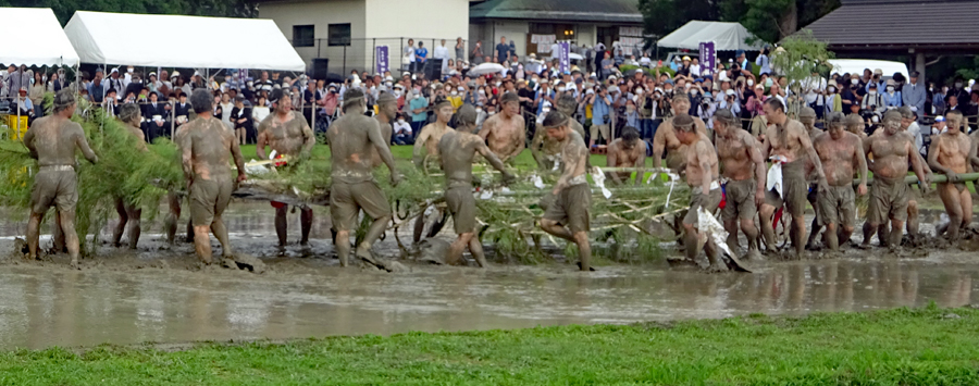 | 磯部の御神田は4年振りだとの事で、露店も人出も沢山で道いっぱいににぎあっていた。重要無形民俗文化財に指定されており日本三大御田植祭の一つでもある。さすがにカメラマンも多く電車で来た方も多くいたようだった。花菅笠を被った早乙女や赤い振袖の少女の姿で田舟に乗って太鼓打つ少年等々、、、華やかで美しい。勇壮な竹取神事は又対照的で泥まみれになって竹を奪い合う姿は逞しく力強い。いずこも人口の減少に伴い担い手が減り、祭り等々がどんどんなくなっていくというニュースを聞くと身近にこんな素晴らしい祭りが継承されていることに対し地域の皆様に感謝と敬意の念でいっぱいになった。 |