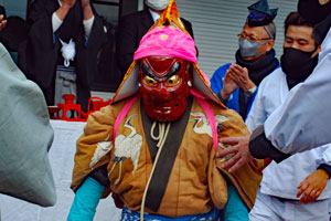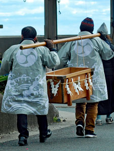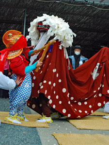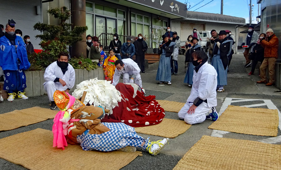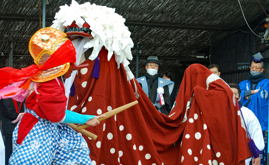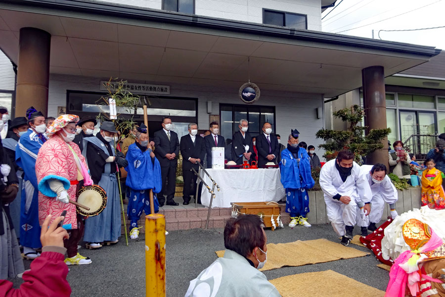 「舞い込んだ!」「舞い込んだ!」「お頭さんが舞い込んだ」と大きな掛け声も勇ましく各家へ1件ずつ舞うのが古くからの習わしだった。(喪中の家を除く)家内安全と大漁を祈願する獅子舞神事は450年余も前から続くふるさとの伝統行事である。今年もこの神事にであえたことに感謝したい。