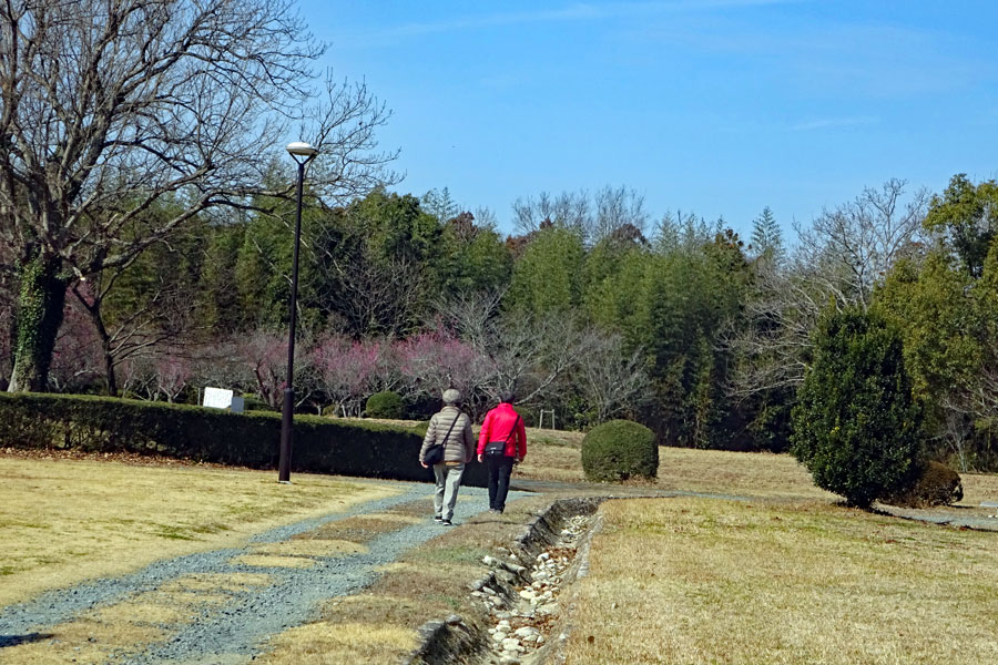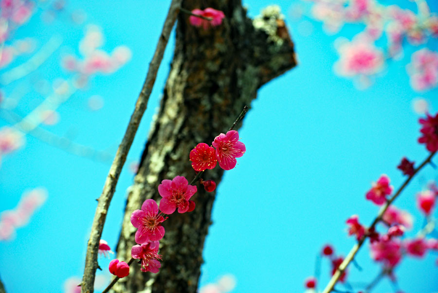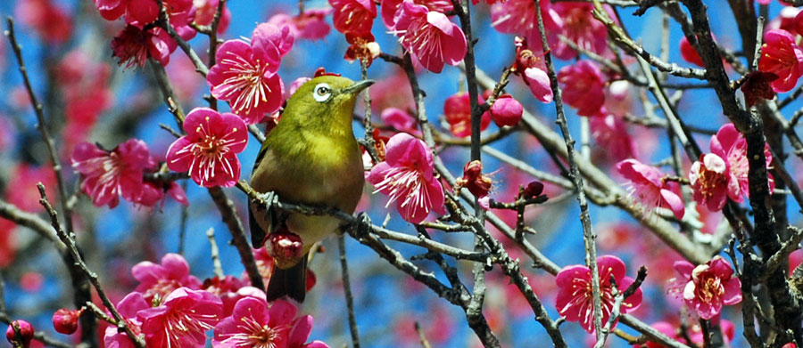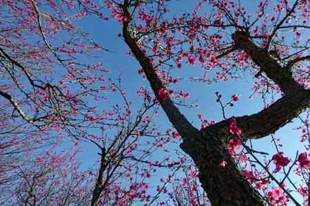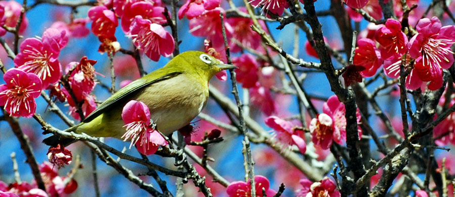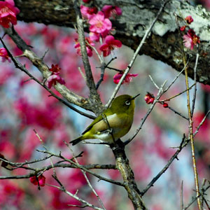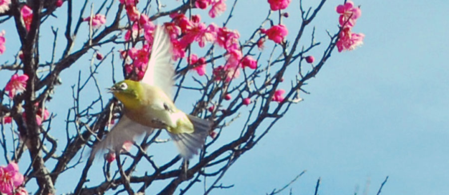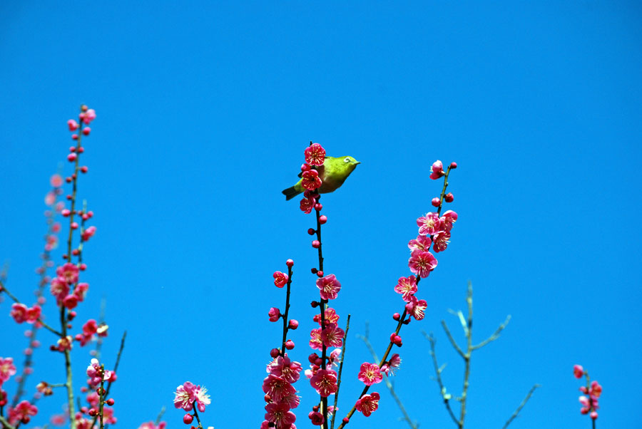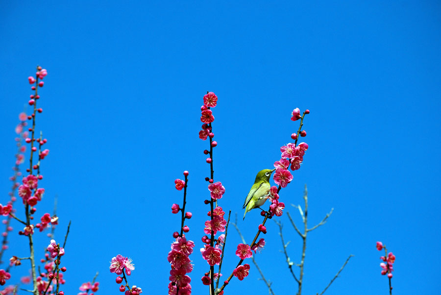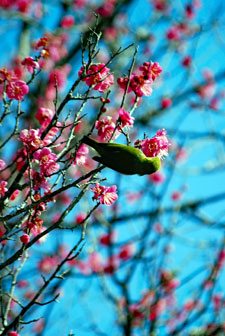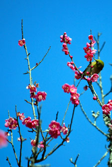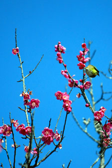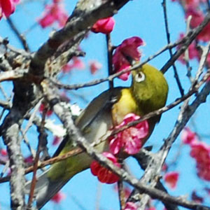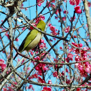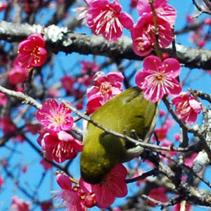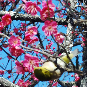 空はうららかに晴れて暖かくもうすっかり春本番の陽気の今日歴史博物館の紅梅は満開を迎えていた。風もなくメジロが楽しそうに飛び交っていた。