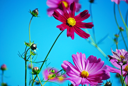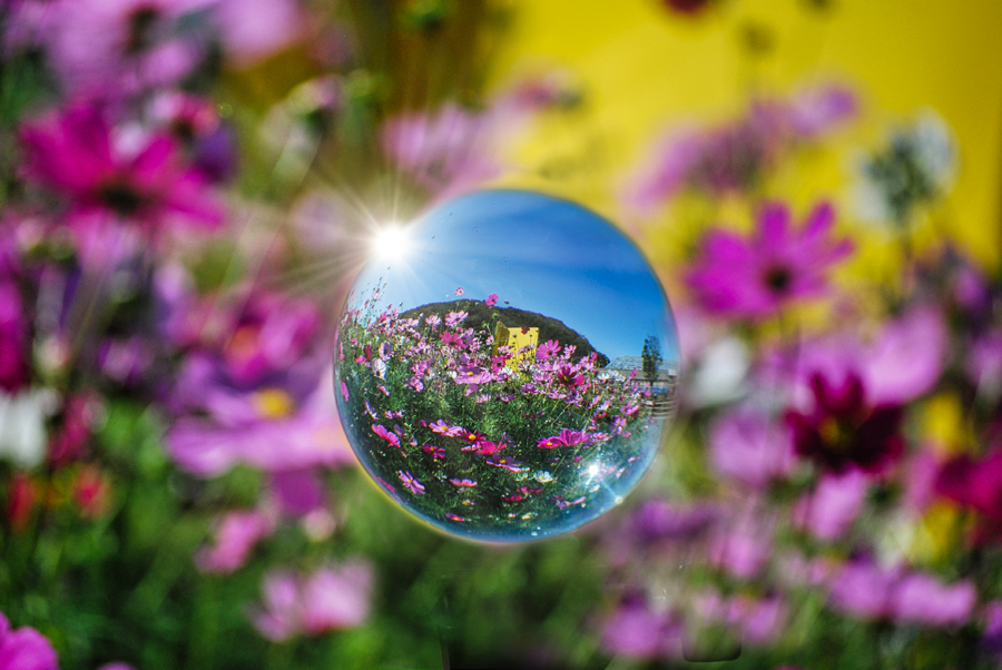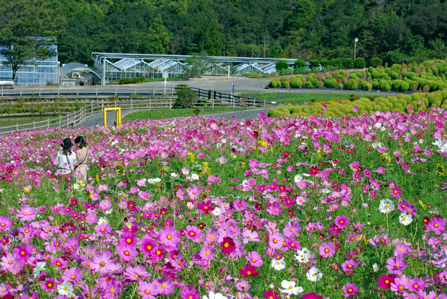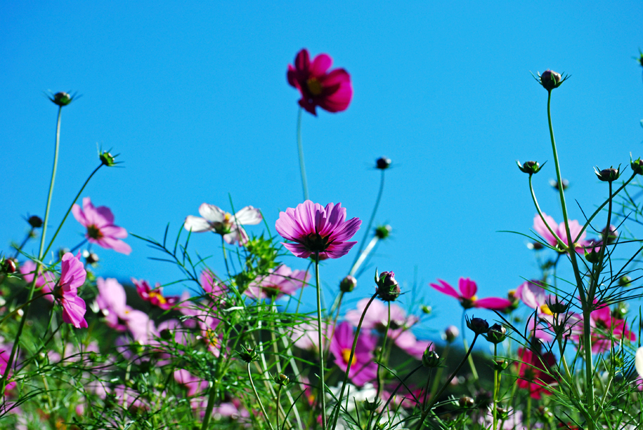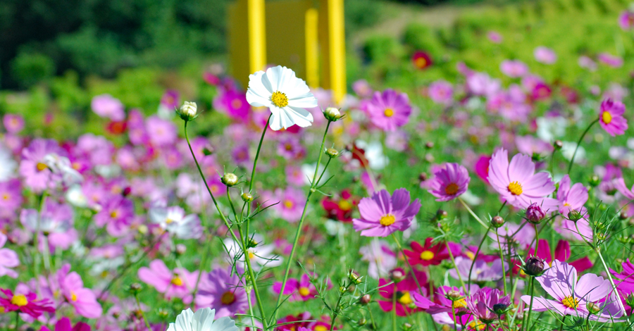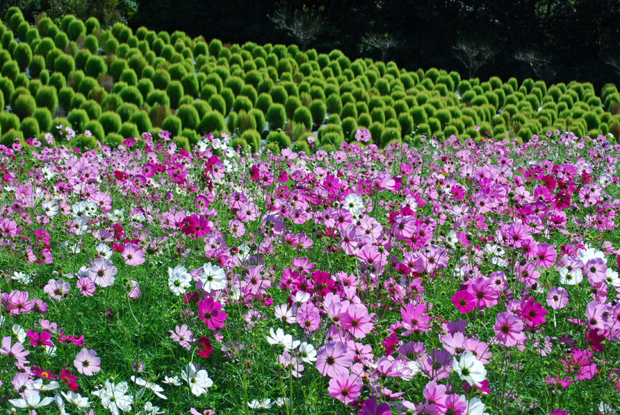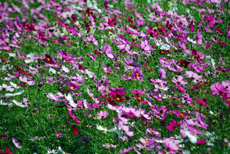 視野いっぱいに紅紫色と白のコスモスの波がさんざめいていた。その果てしなく揺れる風景と秋の花は風の中でこそ美しいと思う。