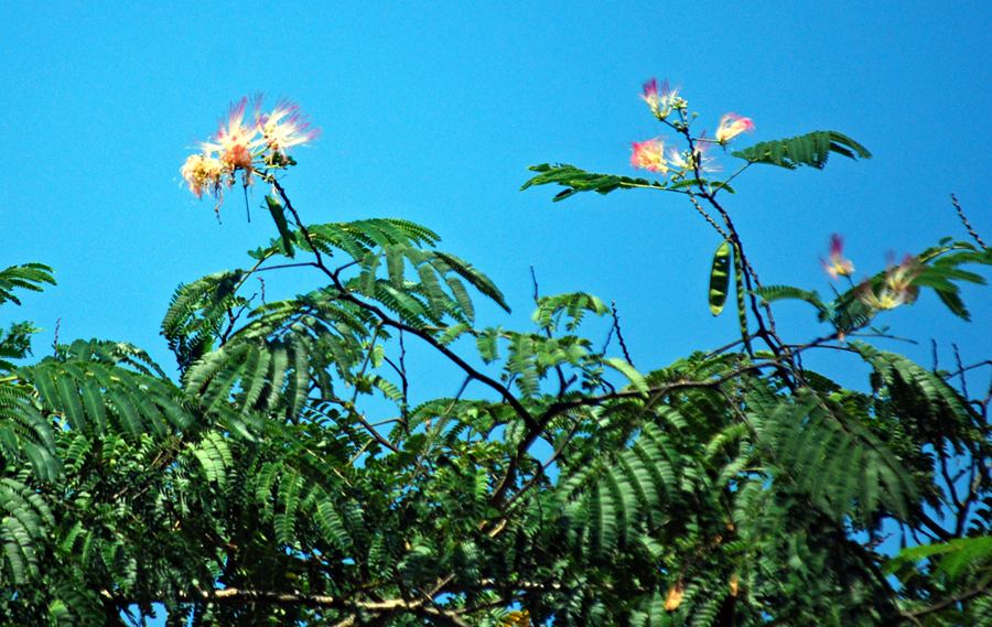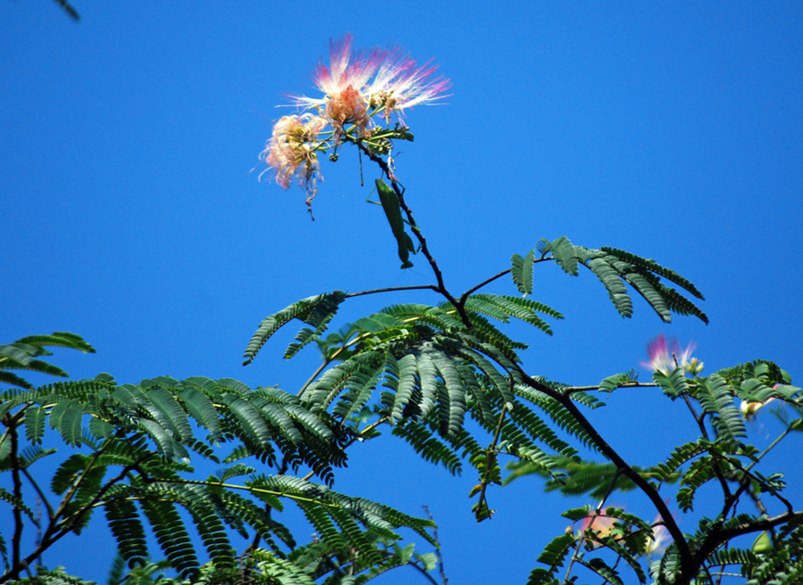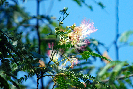 AM:10:00ごろ二見の「道の駅」へ買い物に行く途中池の浦あたりで1本のねむの木を見つけシャッターを切った。あの妖艶なピンク色が青空に映えてとても美しく心なしか空が高く感じられた。帰り朝熊山麓公園の道を通るとカラフルなウエアーに身を包んだスポーツ少年が大勢いるのに出会った。さわやかで逞しく眩しいほどに輝いて見えた。「暑い、暑い、台風、台風」と言っている間に8月が過ぎ去っていき、それは、容赦のない「時」の仕業です。絶え間なく過行く「時」が「老い」を呼びよせます。そして「時」は万人に平等に過ぎていきます。青空に向かい大きく伸びをしました。微かに秋の匂いが感じられました。