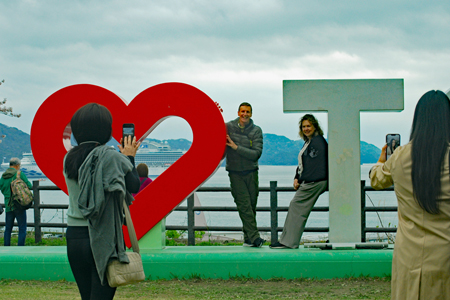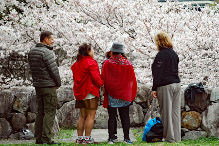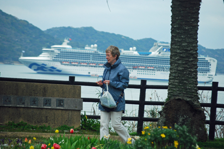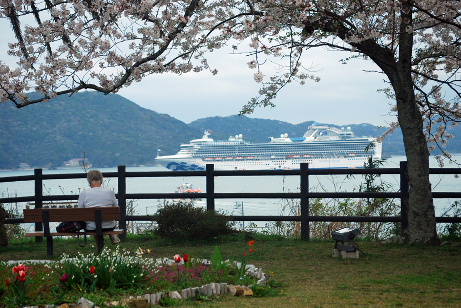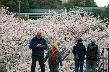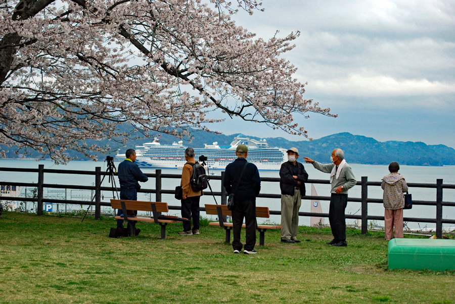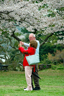 | 曇天の中城山公園に上がった。思いがけづダイヤモンドプリンセスが寄港しており公園の中は外人さんたちが沢山花見を楽しんでいた。何とラッキーなことでしょうか?「棚から牡丹餅」とはこのことをいうのでしょう?人の一生はひとと物との出会いとかかわりによって綴られていくものだと思う。見る、触れる、知る、惹かれる、愛しむ、感動、、、、私達は”ひと”という不思議で未定、未発達の生命体でありそれゆえになおこんなにも桜花に引き寄せられるのでしょうか?花の前のではすべての人が笑顔になれる。花の命は短いかけがえの時間だと思うし大いに楽しみたい。 |