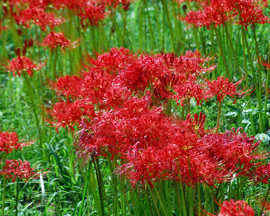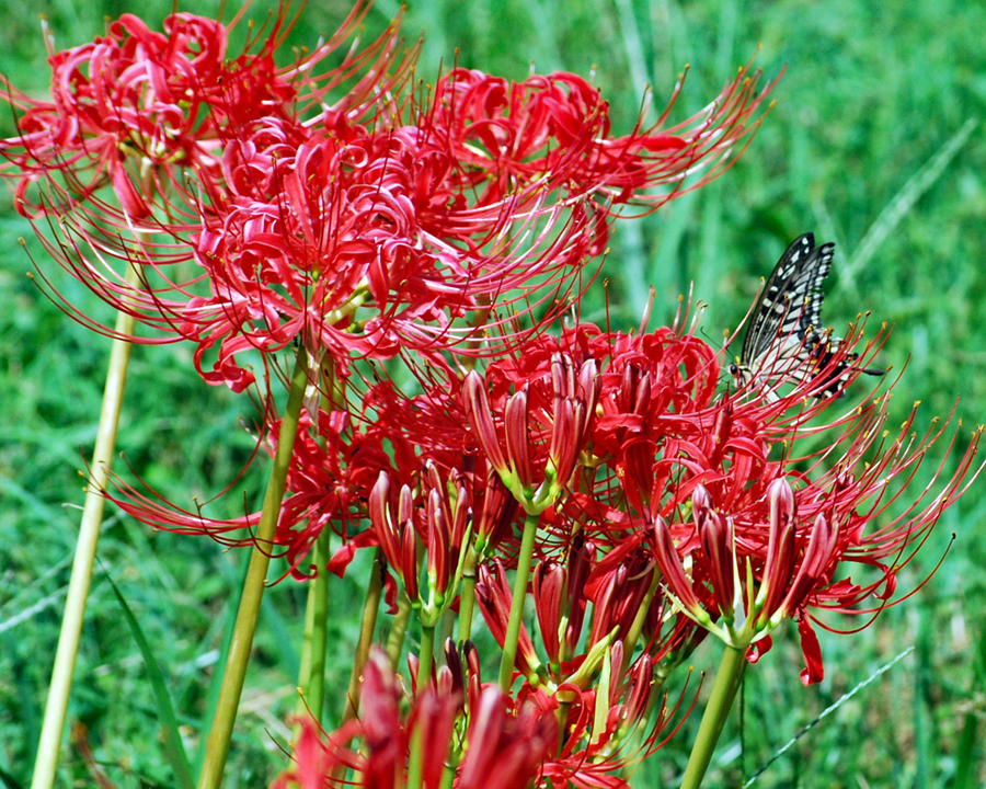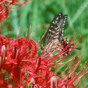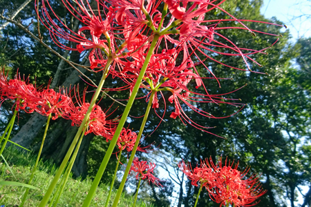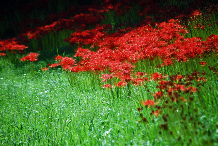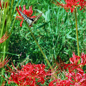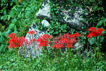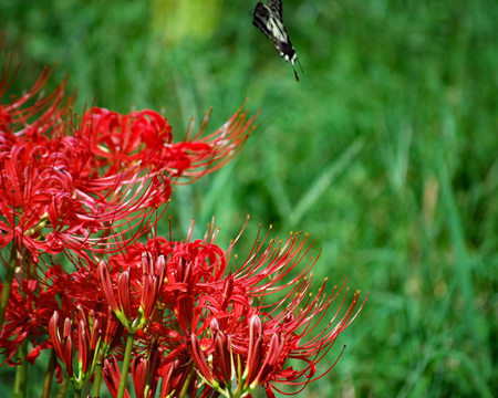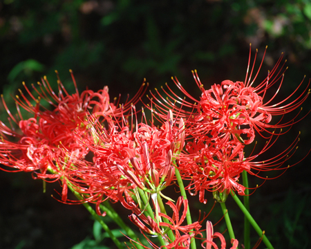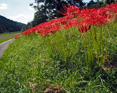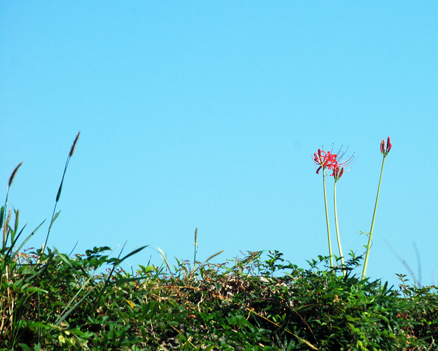 | この花は子供の頃「毒花」と忌み嫌われていた。姉たちはからは手折ったとき茎から出る白い汁が毒なのだと教えられていた。写真に親しむようになってから私にとってとっても好きな花の一つになった。「紅い花なら曼殊沙華 オランダ屋敷に雨が降る、、、、」誰に教えられたのか姉たちが口ずさむのを聞いてか物心つくころからこの歌詞をここまで知っていた。彼岸花の別名が曼殊沙華と知ったのはうんと大人になってからのことだった。太陽が地球から遠くへ去っていく印が日ごとに現れます。そのわずかながら確実に時節の動きに花を通して目を注ぐのが10月という月への私の思いです。 「つきぬけて 天上の紺 曼殊沙華」山口誓子 |