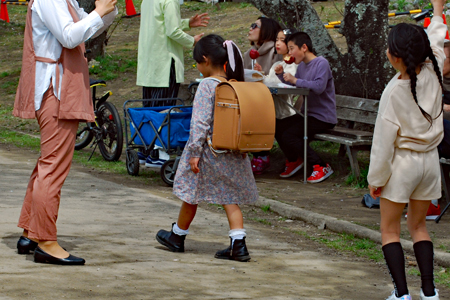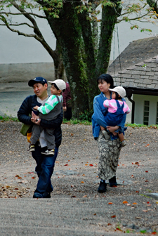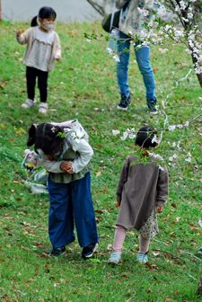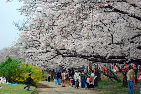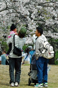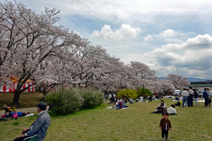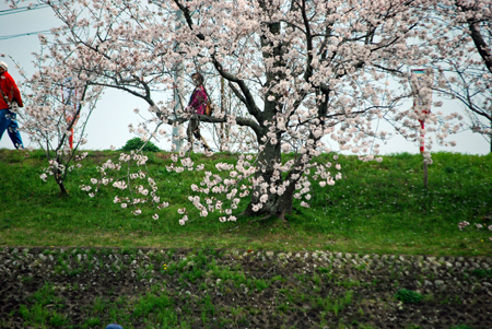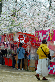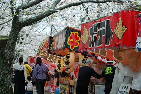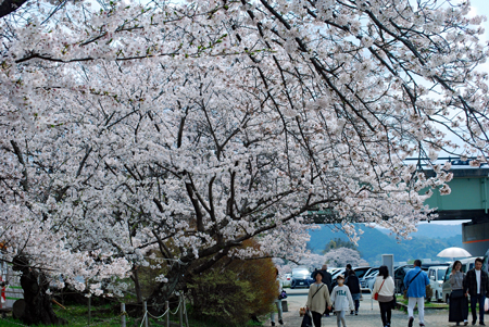 | 田丸城の帰り宮川へ寄った。出店も沢山出ていて大にぎあい。あっという間に満開になった桜。いつまでもつか心配な空模様である。 入学期と重なり楽しそうな家族模様が楽しめた。 |
