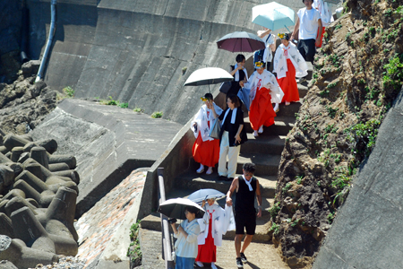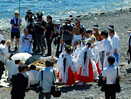 | あらゆるものが「不安定」を基調に動いているように思えてならない。先ず気象がそうだ。「地球温暖化」という言葉を聞いて久しい。それにしてもこの暑さはいつまで続くのであろうか?今日は波切の「わらじまつり」の撮影に行くことを決めた。老体に鞭打つのもラストが見えてきているように思えるから、、、、 道すがら佐田浜港に豪華客船の姿が見えた。青い空、降り注ぐ陽光、動く雲、生まれる風、潮の香り、、、自然の中に身を置いて不安定さを取り除き命をつないでいきたいものだ。 |