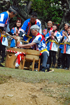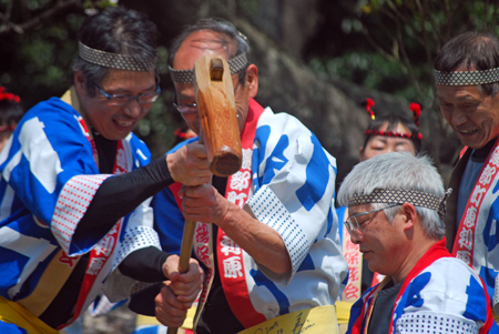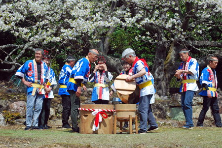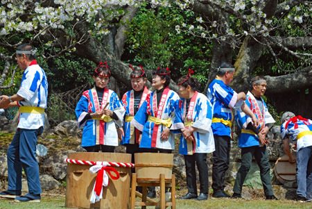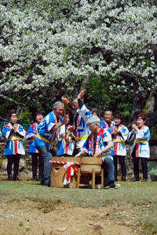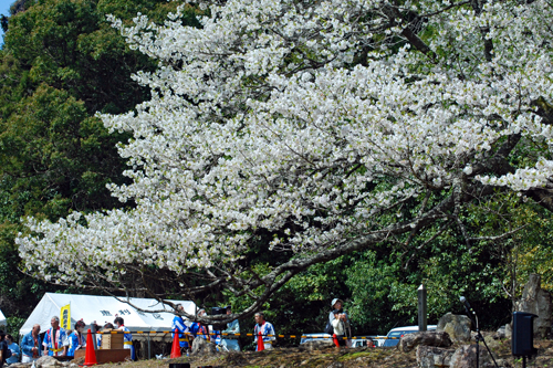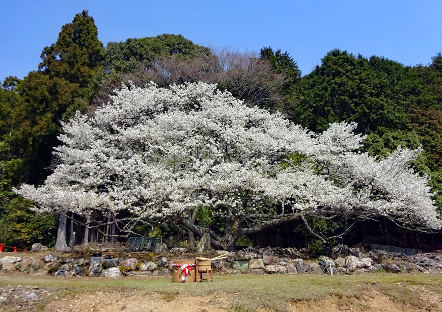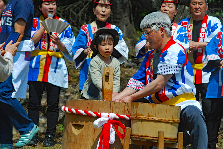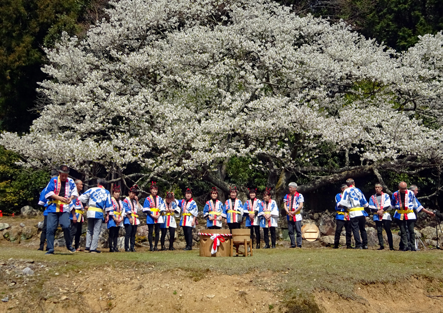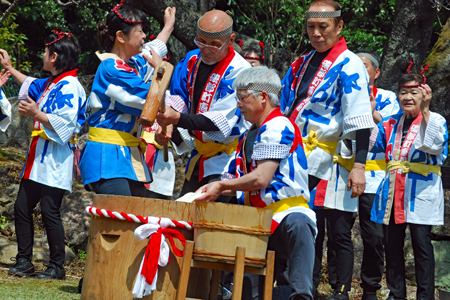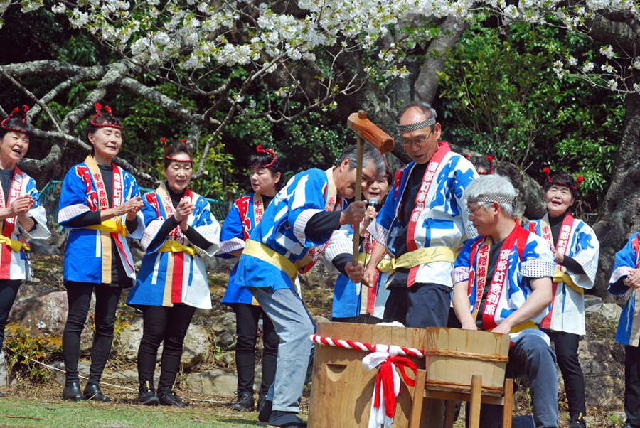 春というより初夏と言った方がふさわしい今日あちこちで桜の開花宣言が相ついだ。磯部町の天の岩戸近くの一本桜の前では保存会の皆様による餅つき大会が行われていた。「アオサ餅」と「きな粉餅」が振る舞われまさに「花と団子」に恵まれた幸せな時間だった。