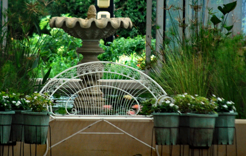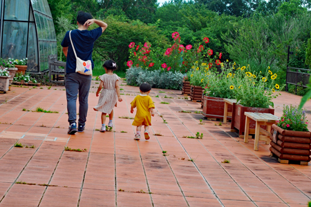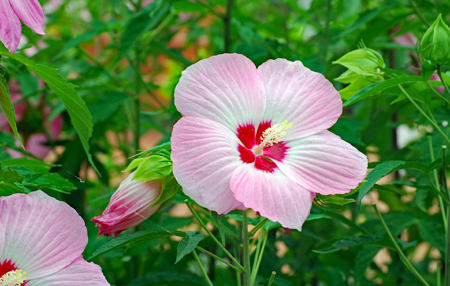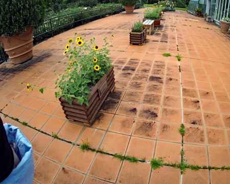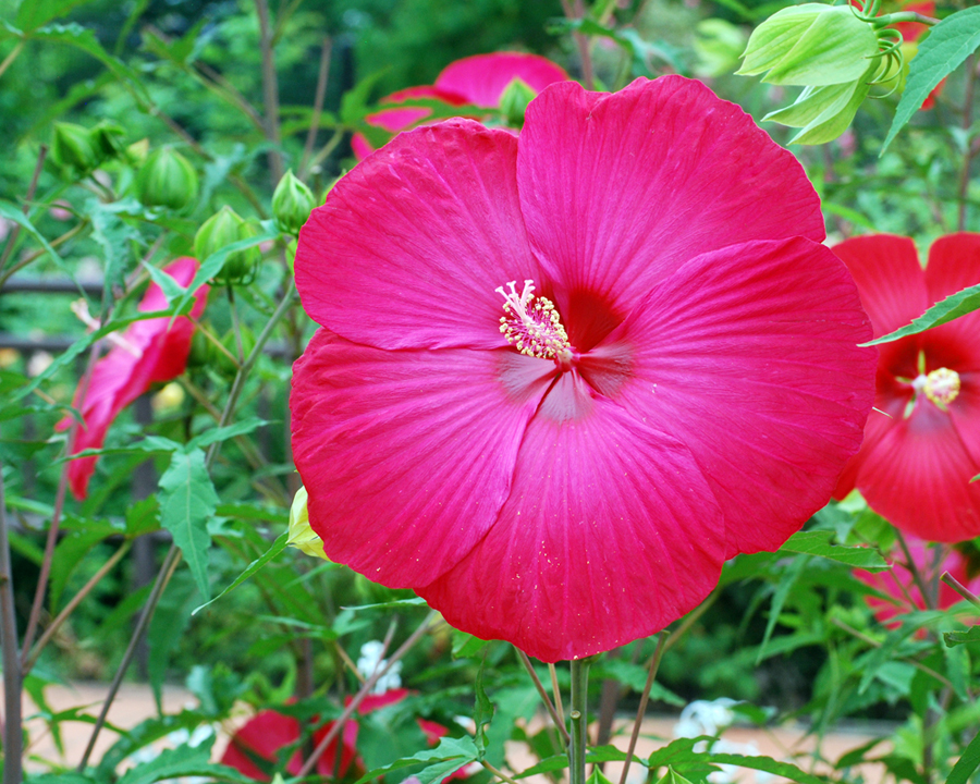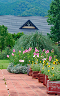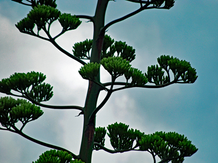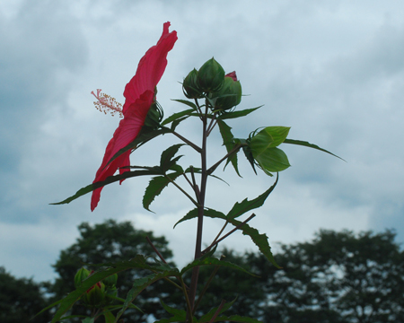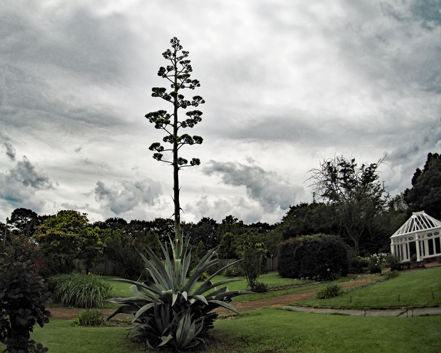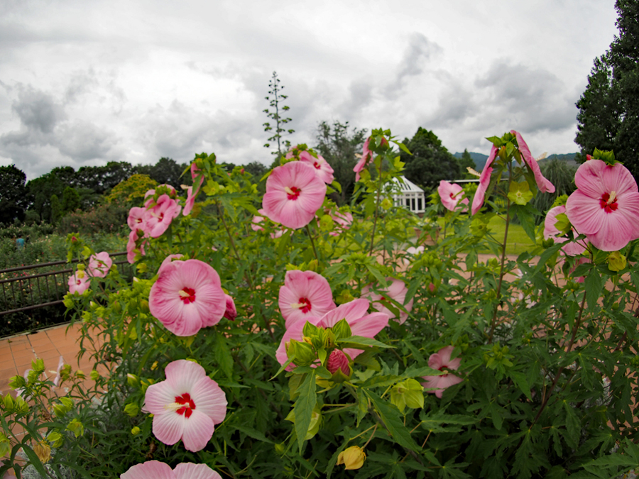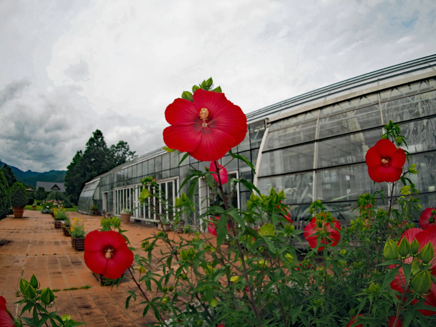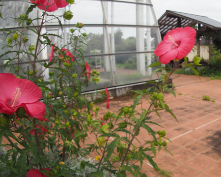 ベルファームのイングリッシュガーデンの花は一休みと言ったところか?タイタンビスカスが自分の出番とばかりに大輪の花をつけて咲き誇っていた。何十年に一度より花をつけないというリュウゼツランもひときわ高くそびえて花をつけていました。