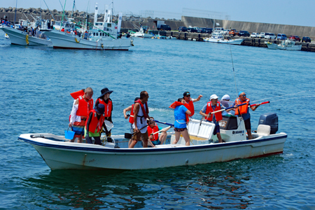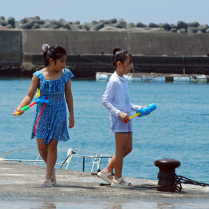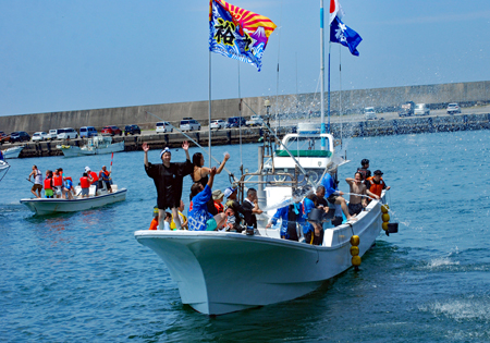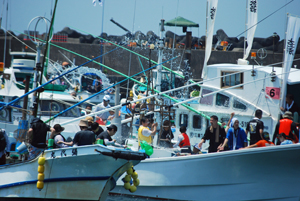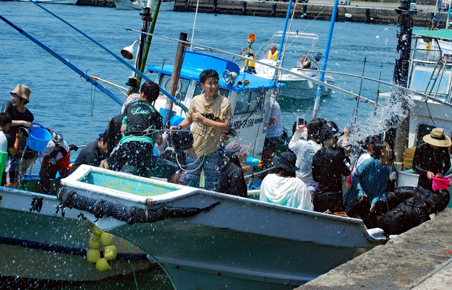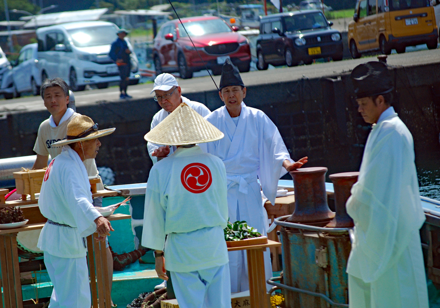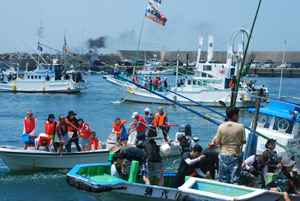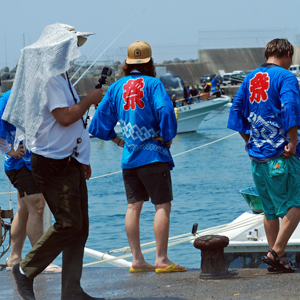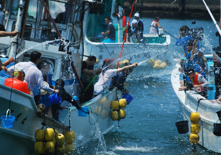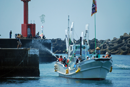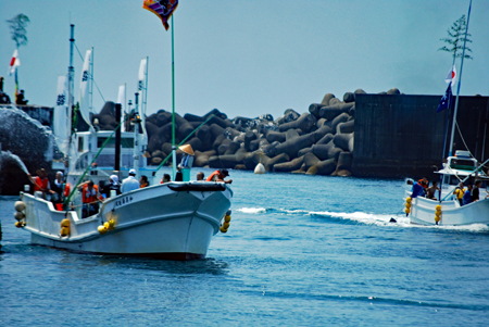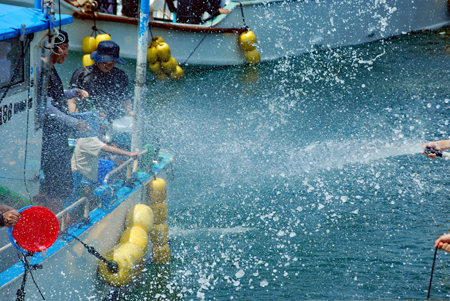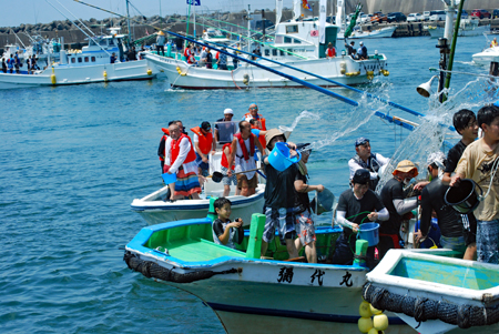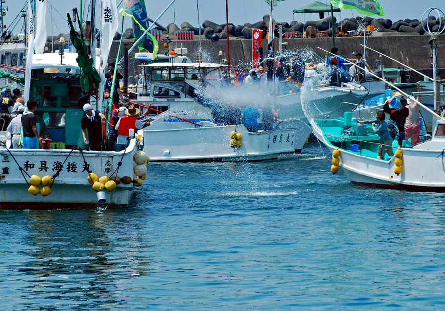| 海の安全と大漁を願う神事の後、人々が海水をかけあう奇祭として知られ800年の歴史を誇る、云々、、、(志摩市HPより)昨日に引き続き今日も暑さは尋常ではない。船と船との間で潮をかけあう漁師町の勇壮な雰囲気を味わって早々に帰宅した。この地は実父の生家が(代々医者の家)あり、幼いころから馴染んできた場所で、いつもやさしくしていただいた泉下に眠る父を初め叔父叔母たちの顔が懐かしく脳裏に浮かび、この祭になるとせっせと足を運ぶのは故郷を恋うる気持ちと少しも変わらないのではないか?、、 |