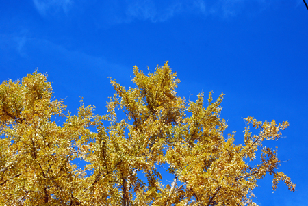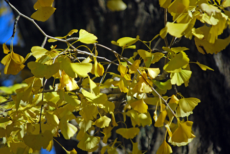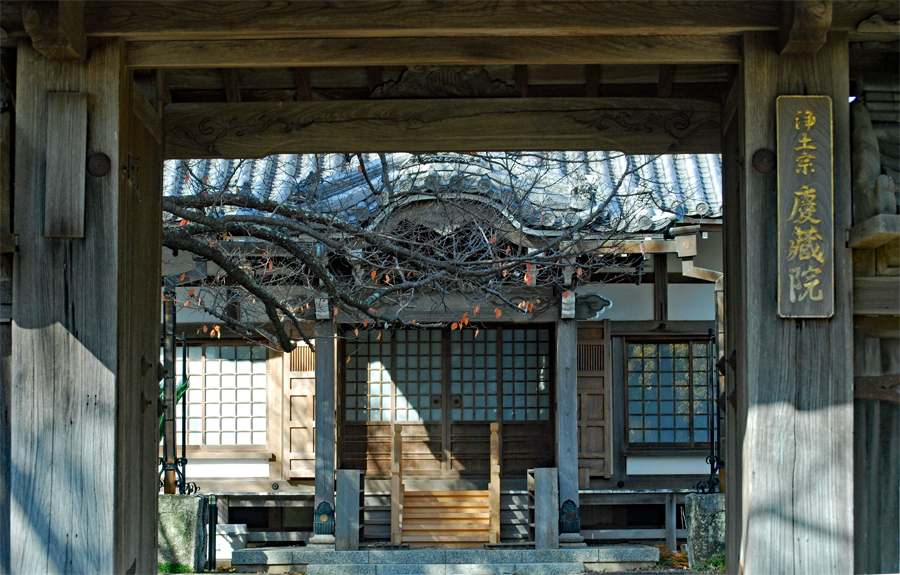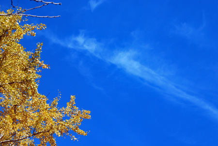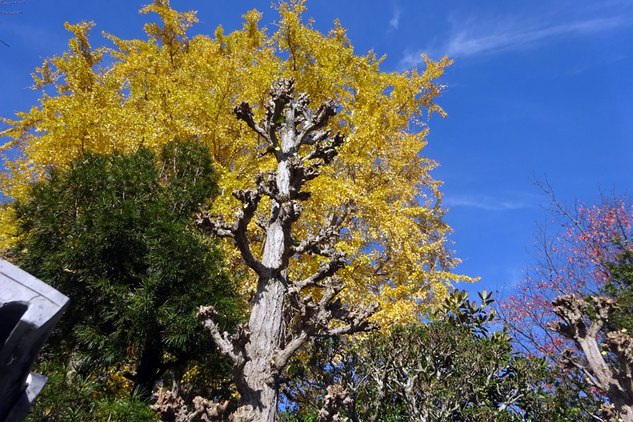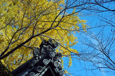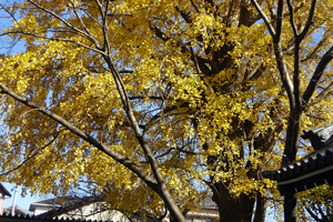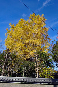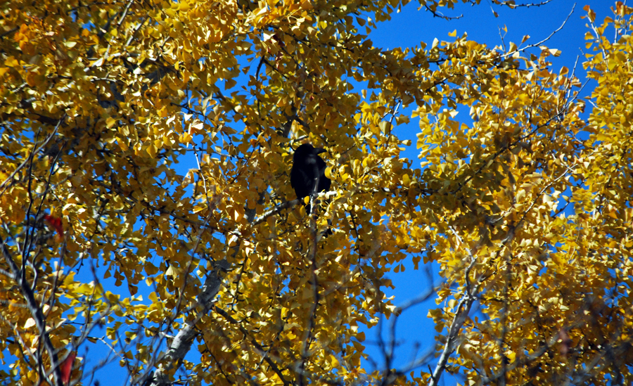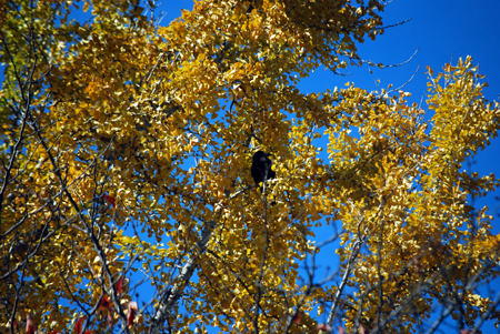 明野の大根のはさかけの撮影の途中見かけたお寺の銀杏が目に留まった。カラスらしき鳥が一羽目に留まった。一体何をしているのだろう?