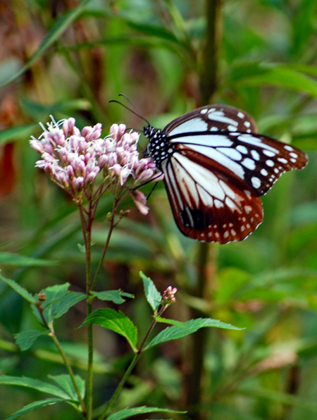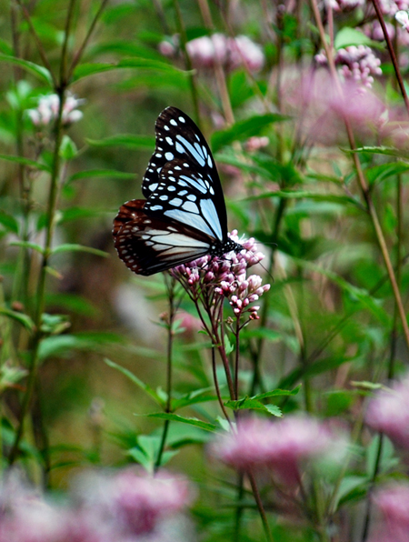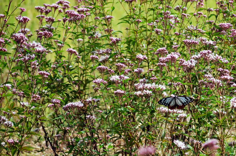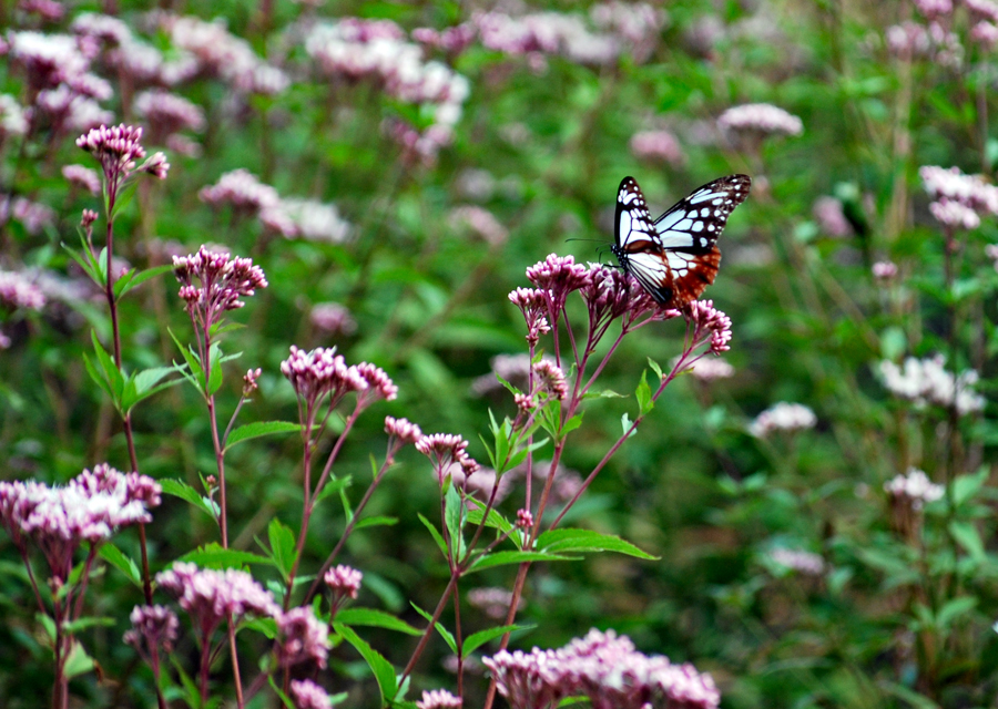 前日の雨から一転して今日秋晴れに恵まれた。以前から訪ねたいと思っていた小俣町へサークルのN氏の案内で「アサギマダラ」の撮影に出かけた。そこは休耕田に一面のフジバカマがほぼ満開を迎えていた。今日は5〜6匹いただろうか?北から南への旅路の途中羽を休めるため好物のフジバカマの密を求めて立ち寄るのだとか、、、初めての撮影挑戦である私は飛ぶ姿は残念ながら撮影できなかったが大きく美しく羽を広げた旅人の姿を大いに楽しむことが出来た。いつもながらこの老体を案内してくださり好奇心を満足させて下するN氏に心から感謝申し上げたい。