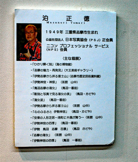 鳥羽一番街2Fと3Fで志摩の写真家「泊 正憲」氏と出口芳男」の写真展が開かれている。伊勢神宮の四季と海女の生活を寫した写真展でいずれも珍しい一瞬をとらえていて良い勉強になった。