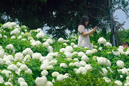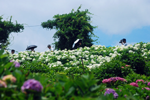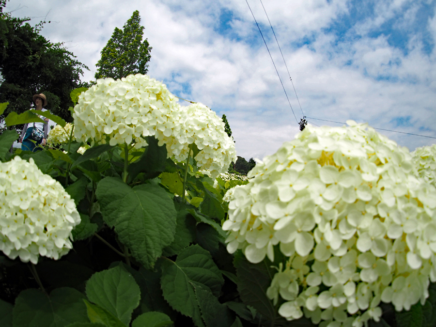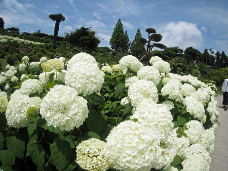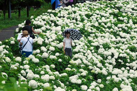 | 昨日来より少し暑さが和らいだ感じの今日かざはやの里では大道芸「じょんがら」の公演があった。十数年前津市の友人に案内されてきたのが初めてだった。純白の紫陽花が満開でその美しさに圧倒された思い出がよみがえった。回り一面が白一色というのは珍しいのではないか?人生のラストがほの見える年齢になると「諦める」とか「覚悟」とかいう気持ちが日日変化する自分がいる。今日も諦めずにアジサイを見に行ってよかった。平和とはこういうことでしょうか? |