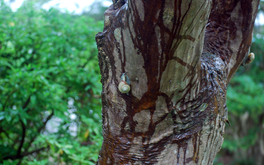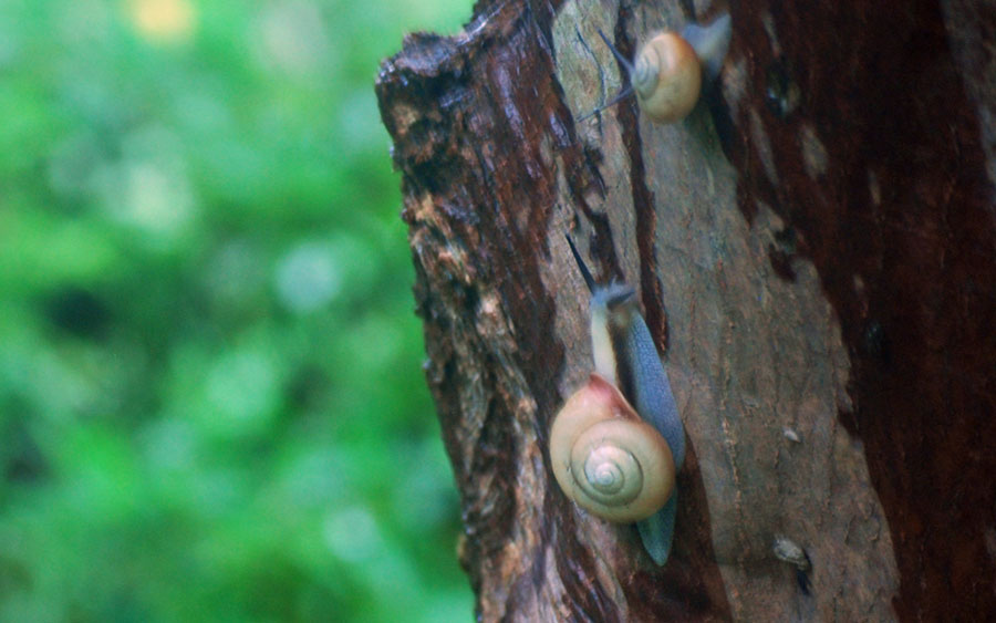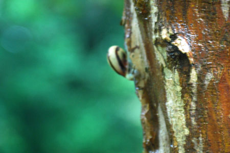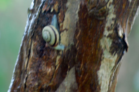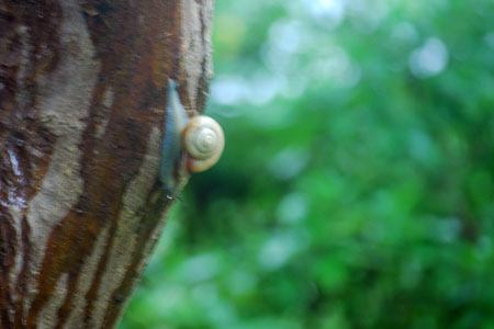 | 瞬く間に10月も終盤を迎えた。あちこちでイベントがたくさんある様子だが私は、残念ながら体力がついていけなくなった。近場で楽しみを見つける他はないと思い常々社友から聞いていた「かたつむり」を見つけようと小雨模様ながら出かけた。美術館前の一本の木にその姿をキャッチ、、、、生まれたての小さな子もいたりしてしばし静かに眺めた。雨が小やみになると白い粒粒の光がさらに輝きを増し心もしっとり潤う感じがして今日も半日良い日であったと思いながら家路に着いた。 | ||