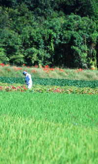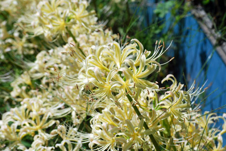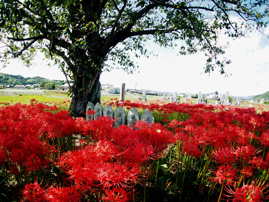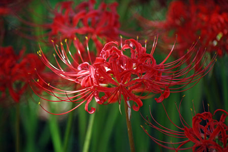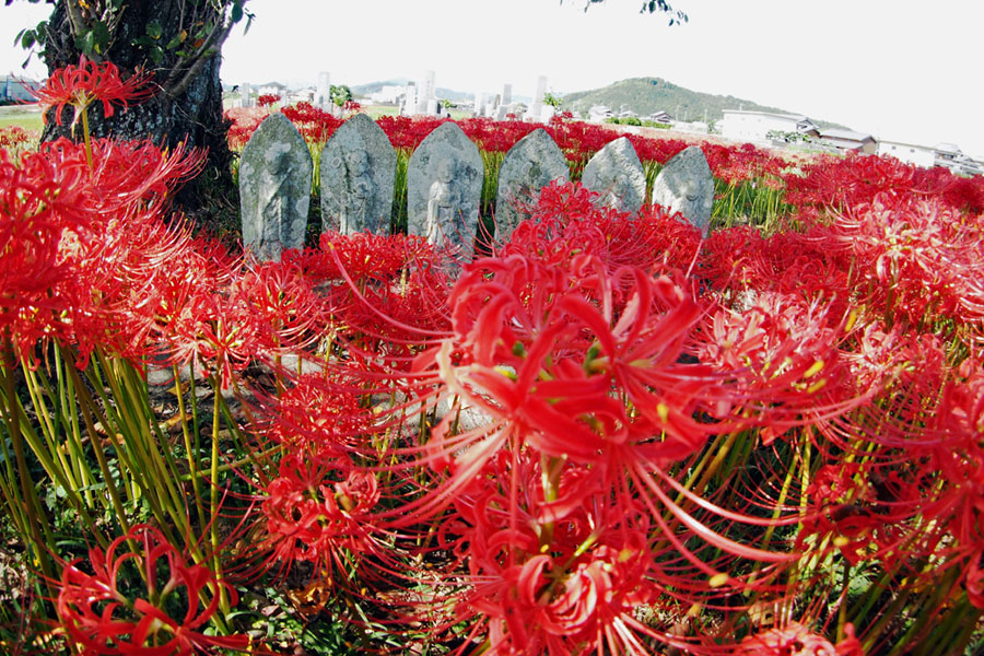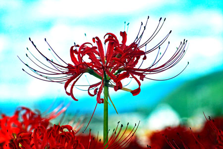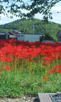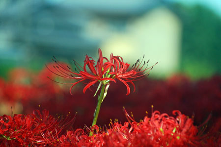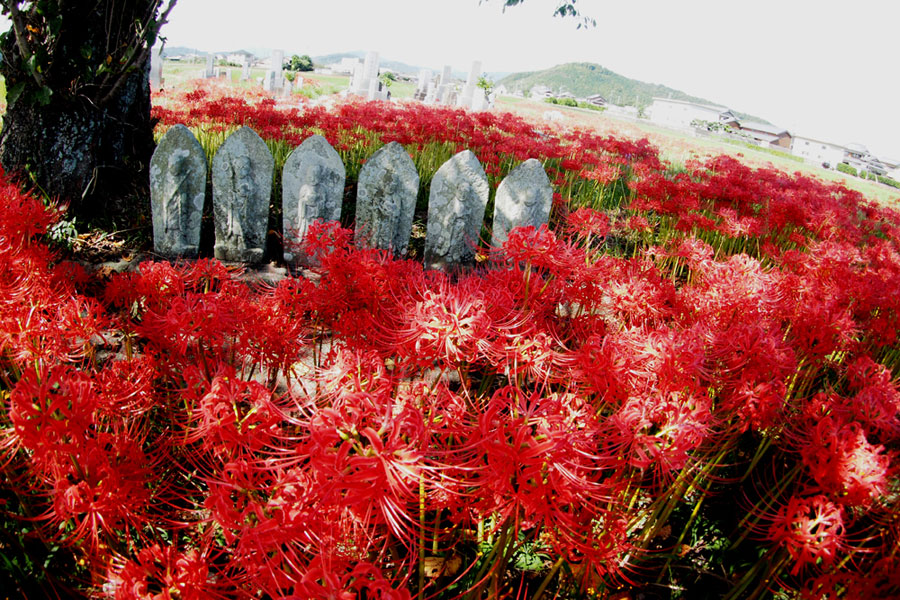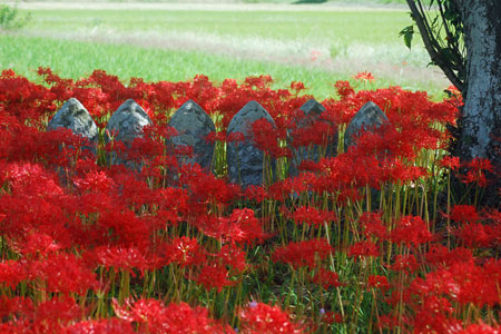 | 「彼岸花」といえば「六地蔵」と写真仲間では有名な場所だが今年は開花が遅く今か今かと待たれた。昨日の情報で今が満開との事で早速出かけた。すでに三脚を立てて頑張っている先客が一人見えただけで静かな田園風景が広がっていた。燃えるような深紅の赤が晴れた青空に映えてひときわ美しい。彼岸の時期に咲くのでつい彼岸花と言ってしまうが「曼珠沙華」という名のほうが私は好きだ。