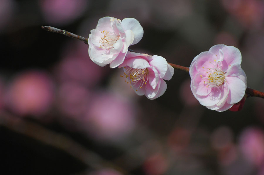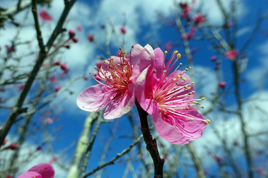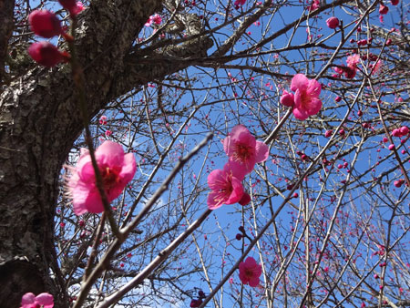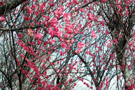 | 暖かさに誘われて上記3か所を巡った。斎宮の紅梅は終焉を迎えていて白梅がちらほら咲き始めていた。一番時間をかけたのが昨日から始まった美術館の特別展だった。あまり絵心もなく絵画に関心があったわけではないが以前から異次元に来たような静寂な時間がとっても好きでたまに訪れる時間を持っていた。昨年のNHKの大河ドラマ「べらぼう」に深く興味を持ち「蔦重」に始まり歌麿、写楽、北斎、広重、など登場する小説にはまった。休憩をとる椅子に座り外を眺めると小雨がぽつぽつ降り注ぎ濃いピンクの桃の花が満開だった。そこだけが春爛漫の光が伸びているのを感じた。 | ||