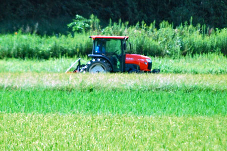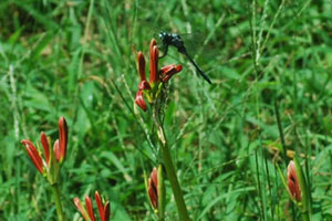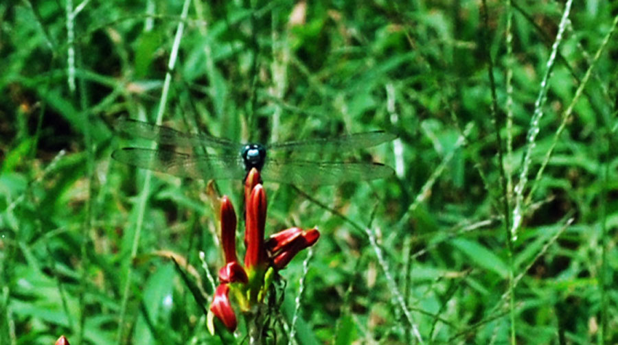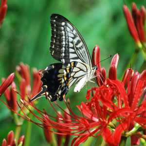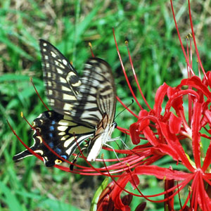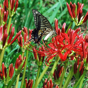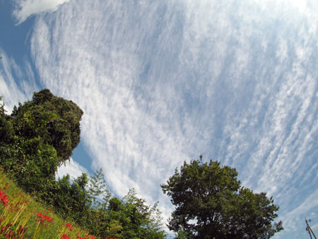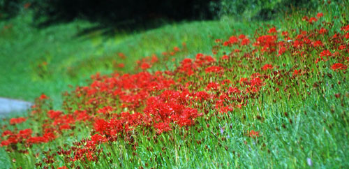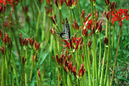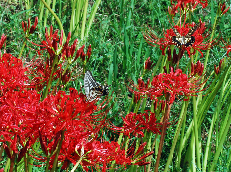 にその場所へ車を走らせると農作業をしている人がいて、トンボが飛び交い蝶が舞う。空はどこまでも青く澄み渡って高く、深紅の花が咲き誇っ